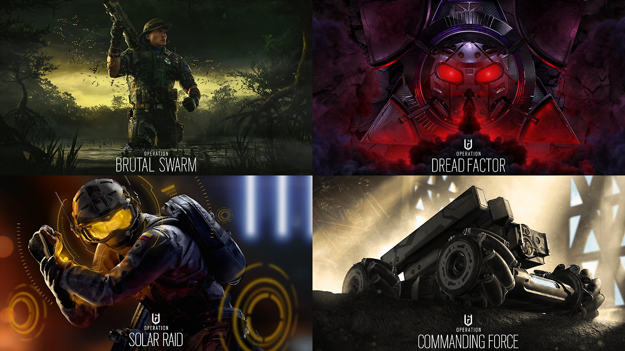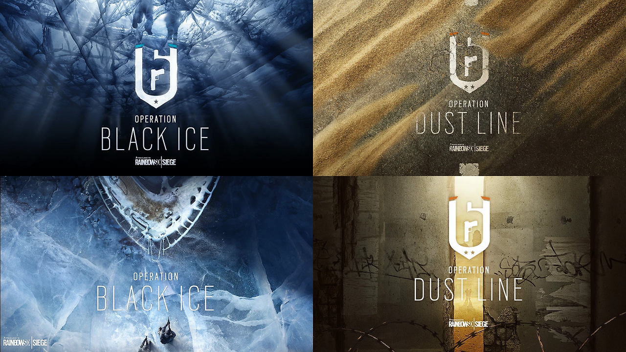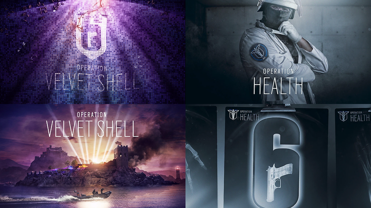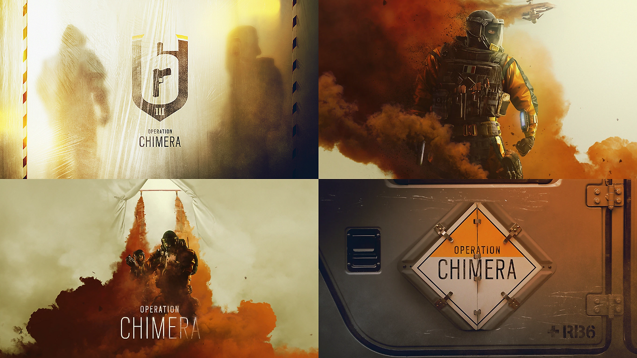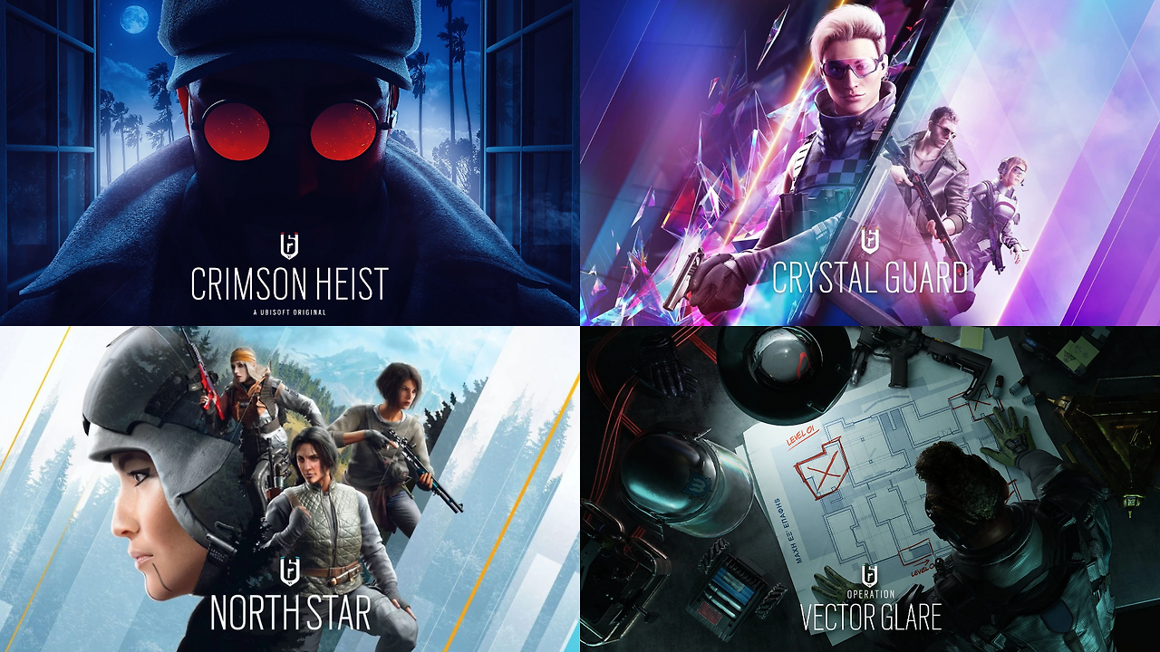 초창기엔 어두운 배경에서 총을 겨누는 전형적인 밀리터리 장르의 클리셰로 표현된다. 우측 이미지의 좌상단 <시즈>가 시즌제 라이브 서비스로 전환하면서 표현력의 한계가 해방되는데, 점차 인물 중심에서 색감과 상징적 오브제만으로 시즌 별 분위기를 전달하는 Rainbow Six만의 세련된 문법을 찾아간다.