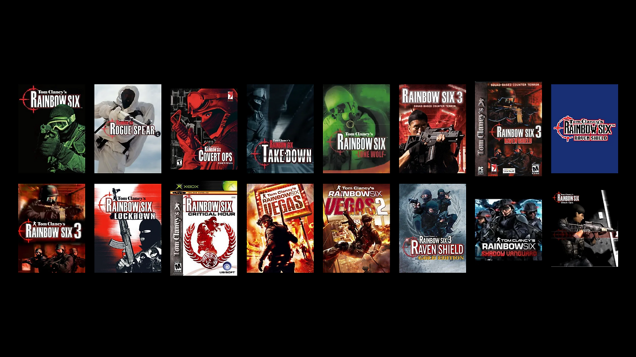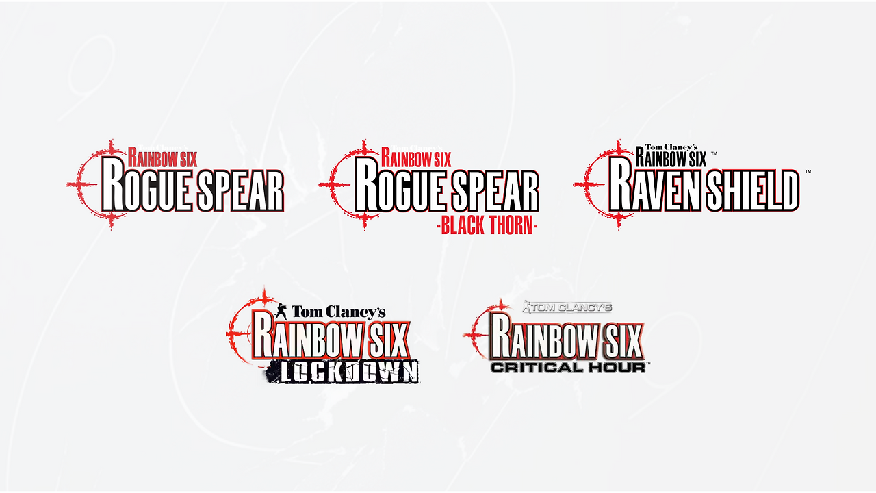 초기 로고들의 특징은 좌측에 붉은색 피를 연상시키는 불규칙한 선으로 그려진 십자선 마크이다. 이 시기의 <레인보우식스>는 택티컬 리얼리즘을 지향했기에, 플레이어가 대테러 부대의 대원이 된 듯한 긴장감과 살상성을 표현했다. 후속작 <락다운>, <크리티컬 아워>부터는 사격 자세의 군인 실루엣이 텍스트 옆에 슬쩍 등장하는데, 게임의 포커스가 '사격'에서 '오퍼레이터(대원)'으로 옮겨가고 있음을 로고에서부터 알 수 있다.