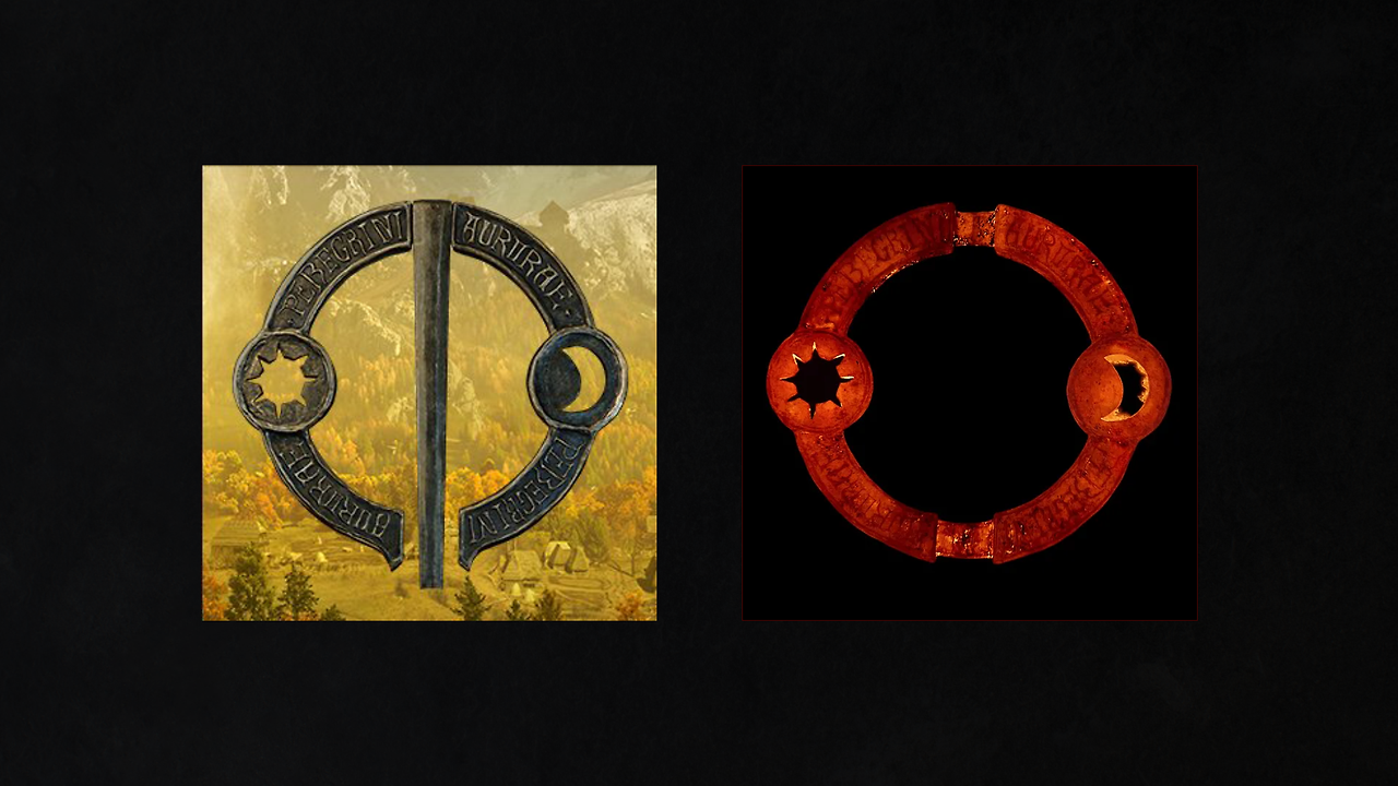 고전적이고 무게감이 느껴지는 골드톤. 심볼은 세계관의 핵심 오브제임을 암시하며, 판타지 분위기를 구축한다.