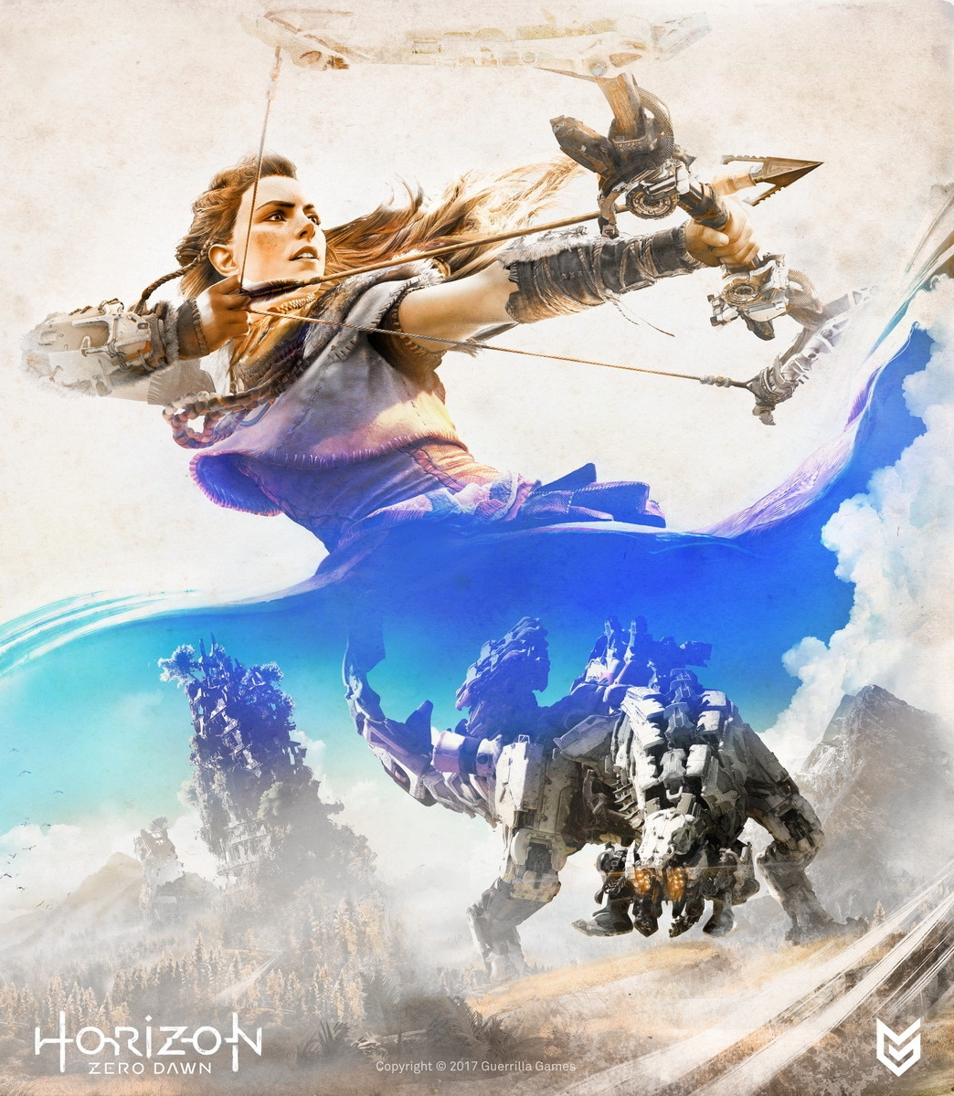 호라이즌 시리즈의 시작점인 이 로고에는 두 가지 상반된 질감이 공존한다. 기계 문명을 상징하는 차가운 직선과 슬릿 디자인, 그리고 인류의 원시성을 상징하는 거친 붓터치의 질감이다.
