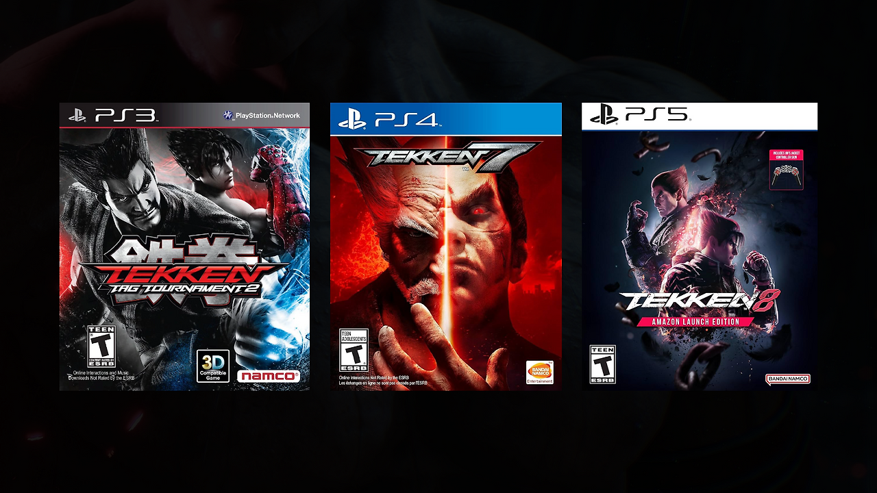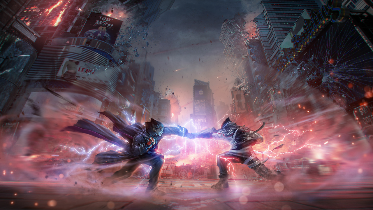 2:2 시스템을 강조하기 위해 두 인물이 겹쳐진 구도의 태그 2. 철권 7은 마지막 혈투를 상징하는 붉은 화염이 메인 테마다. 철권 8의 캐릭터 디테일은 실사에 근접한 수준이다. 8 시리즈에 와서야 인물로 꽉꽉 채운 구성이 아닌, 여백의 미가 보인다.