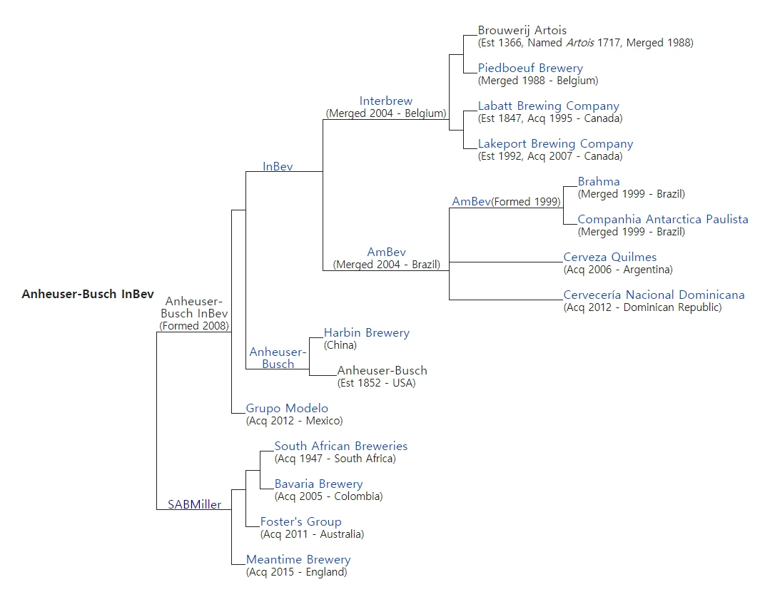 그럼 어쩌다가 필스너 우르켈은 일본 맥주가 되었을까? 여기에는 대단히 복잡하고 치열한 글로벌 맥주 회사들의 인수 합병의 역사가 숨겨져 있다. 주인공은 사브밀러SABMiller와 AB InBev이다. 조금 복잡할 수 있으니 정신 바짝 차려야 한다. 사브밀러는 1895년에 설립한 남아프리칸 브루워리 South Africaan Brewery와 밀러 브루잉 컴퍼니 Miller Brewing Company가 합병한 회사이다. 이 회사는 1999년 필스너 우르켈의 지분을 사들여 이때부터 필스너 우르켈은 사브밀러의 소유가 되었다. 한편, AB InBev는 2015년 사브밀러를 사들여 AB InBev SA/NV가 되었는데, 이 합병은 당시 맥주 회사 1위와 2위 간의 합병으로 공룡 기업이 탄생하는 순간이었다. 그런데 AB InBev의 인수 합병의 이력은 더욱 화려한다. 세계젹으로 가장 많이 팔리는 버드와이저를 생산하는 미국의 대표 맥주 회사는 1871년에 설립한 앤하이저-부쉬 컴퍼니Anheuser-Busch Company이다. 그런데 이 회사는 2008년 벨기에와 브라질의 다국적 기업인 인베브InBev에 매각됐다. 인베브 또한 스텔라 아루뚜아, 호가든 등으로 유명한 벨기에 맥주 회사 인터브류Interbrew와 브라질의 국민 맥주 브라흐마Brahma를 생산하는 앰베브Ambev가 2004년에 합병한 기업이다.