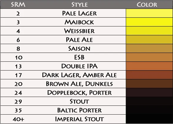 여기서 맥주의 색상은 SRM이라는 지표로 알 수 있습니다. SRM은 현대 맥주 양조에서 맥주의 색을 표시하기 위해 사용하는 표준 중 하나입니다. 숫자가 낮을수록 연한 색, 높을수록 짙은 색입니다.