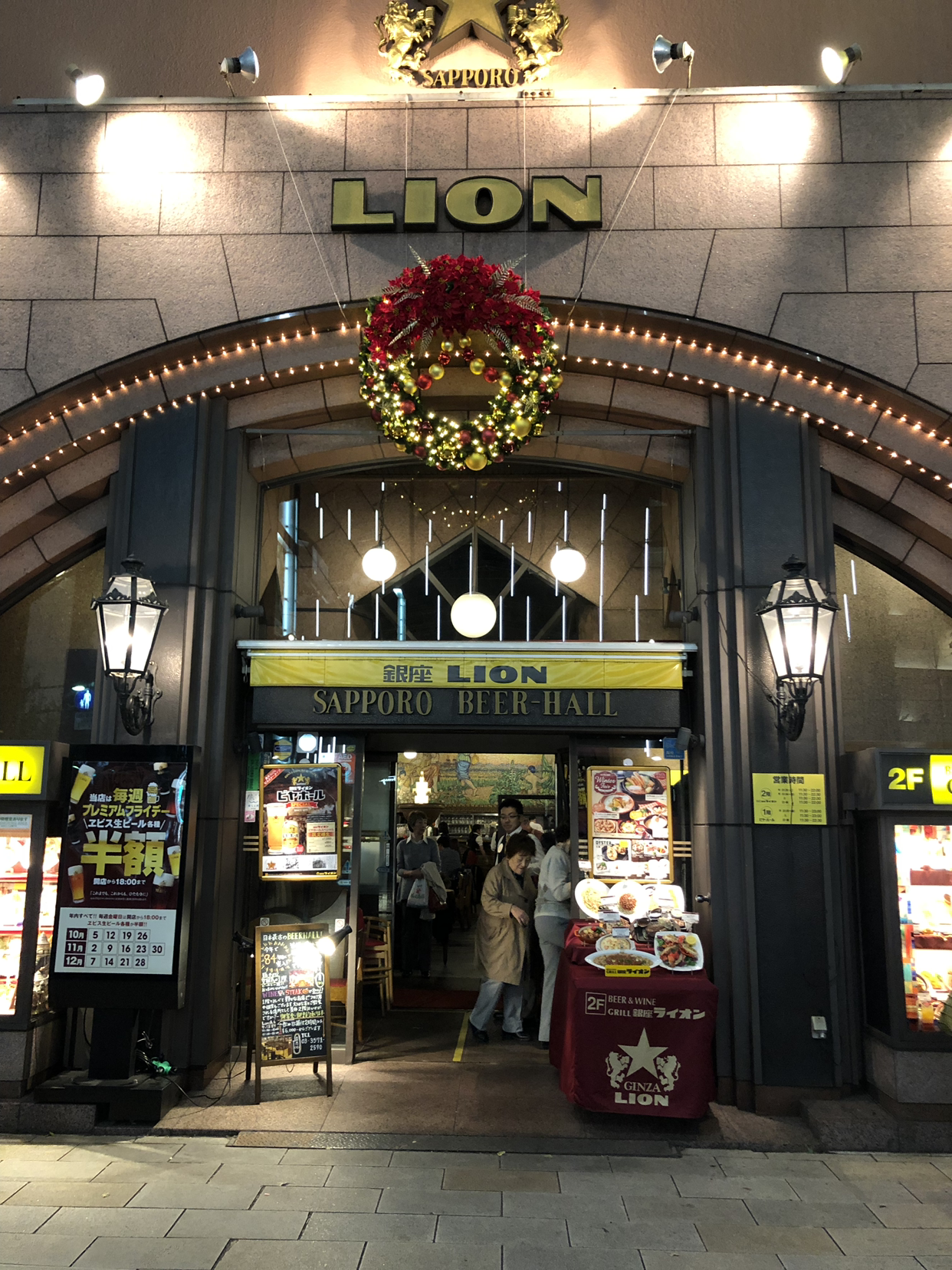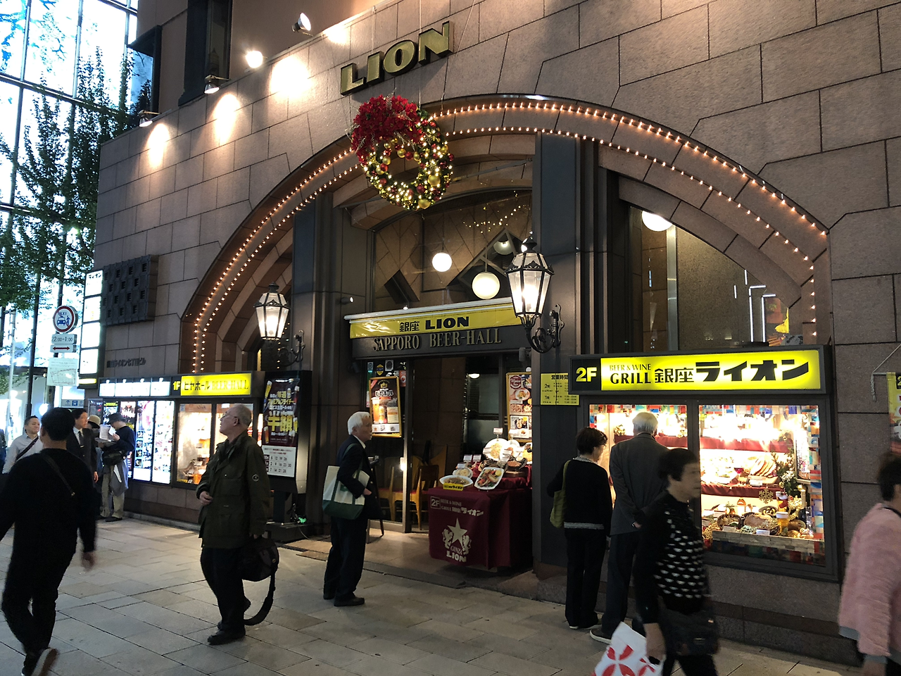 긴자 라이온이라 불리는 에비스 비어 홀은 1899년에 오픈한 일본 최초로 대중을 상대한 맥주집이다. 현재도 도쿄 긴자에서 운영되고 있으며, 여러 종류의 에비스 맥주와 삿포로 맥주를 생맥주로 판매하고 있다. 위치는 긴자역에서 남서쪽으로 약 400m 정도 떨어져 있고 걸어서 5분 정도 걸린다. 신바시역에서는 800m로 걸어서 약 10분이면 갈 수 있다. 대단한 역사에 비해서는 한국의 여느 맥주집과 크게 다르지 않다.