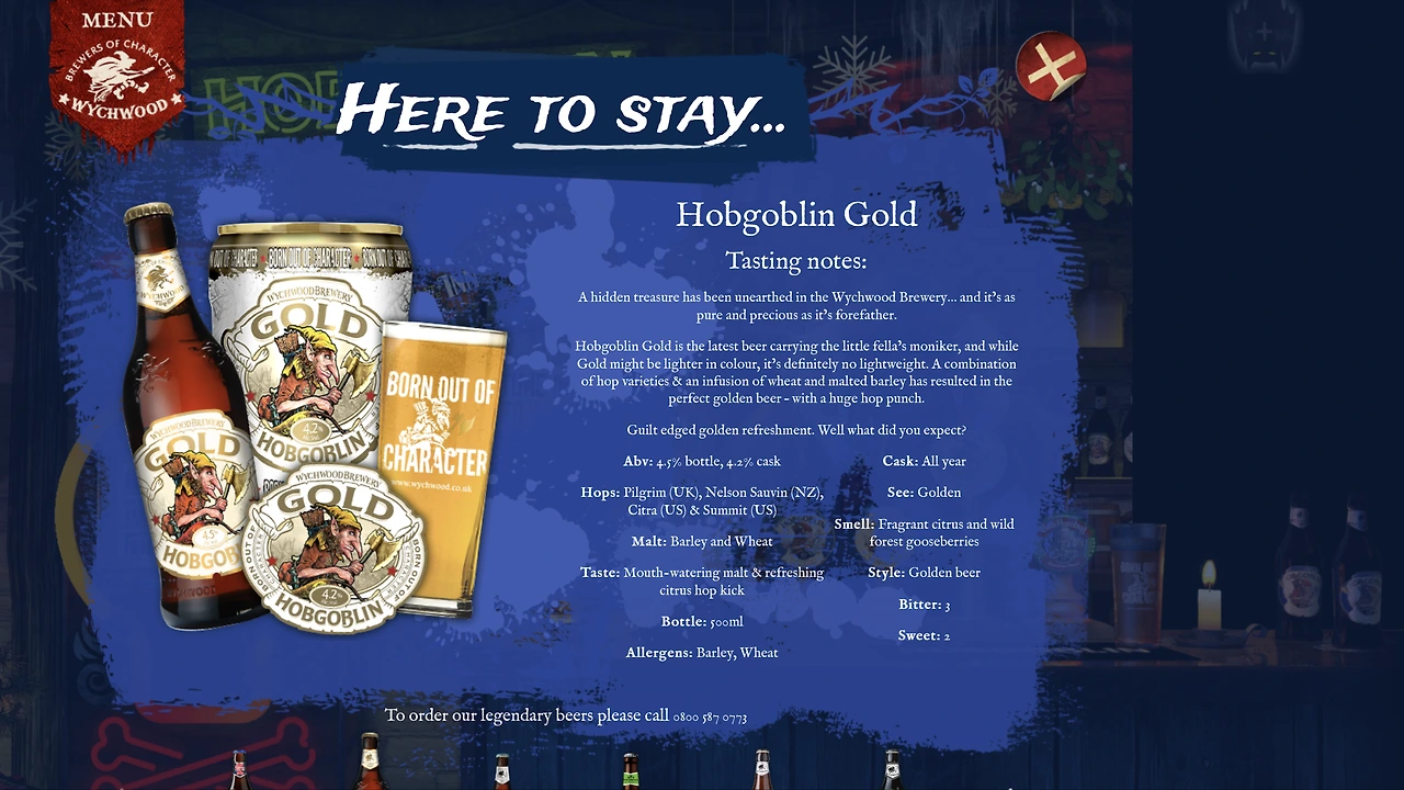 홉고블린은 위치우드 양조장에서 가장 많이 알려진 대중적인 맥주이다. 알코올 도수는 병맥주와 캔맥주가 5.2%이고, 캐스크로 판매할 때에는 4.5%이다. 처음에는 캐스크 맥주의 도수가 6.5%였던 것이 5.6%, 5.0%로 점차 내려와 현재의 도수에 이르렀다. 위치우드 양조장의 설명에 의하면 홉고블린을 루비 맥주라고 부르는 데, ‘초콜릿 토피 몰트 향을 가진 풀 바디에 맛의 균형이 잡혀 있고, 적당한 쓴맛과 독특한 과일 향이 나는 맥주’라고 한다. 마셔보면 모두 공감하는 말이다. 여기에 개인적으로 덧붙이자면 에일임에도 불구하고 적당한 탄산감이 있어 마시기 편하다는 것이다. 원재료를 살펴 보니 정제수, 보리맥아, 홉 외에 탄산가스라고 있는데 아무래도 내가 느낀 탄산감은 맥주를 발효할 때 자연적으로 발생한 것은 아닐 수도 있다. 홉고블린은 영국에서 처음으로 맥주병의 라벨에 그림을 형상화한 맥주로 유명하다. 이전에는 모두 간단한 텍스트로 라벨을 꾸몄다. 홉고블린은 현재 영국에서 5번째로 많이 팔리는 에일 맥주이다.