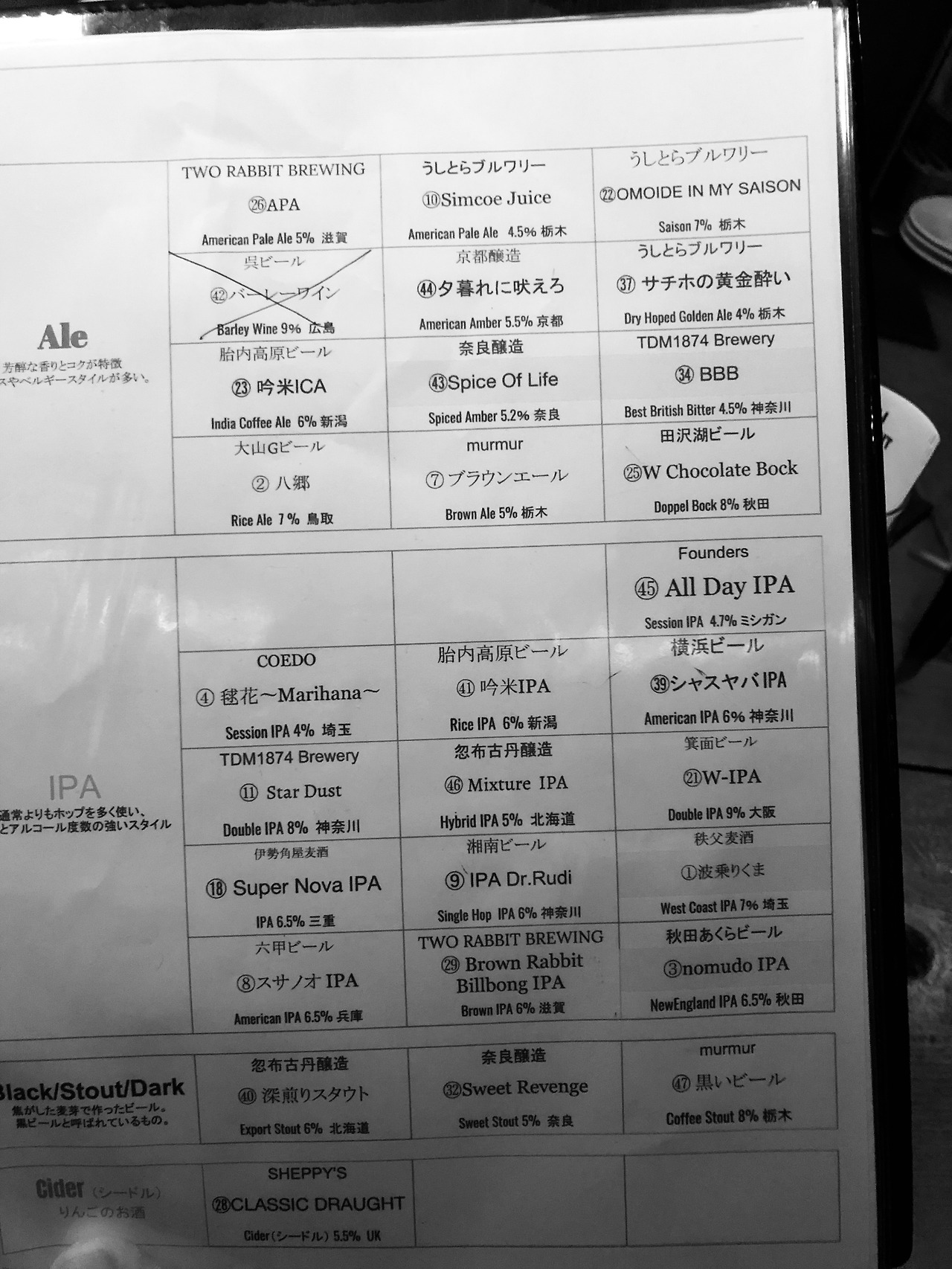 아이브루의 맥주의 가격은 파인트 470ml 한 잔에 690엔(부가세 별도), 하프 파인트 270ml 한 잔에 390엔으로 다른 펍보다는 저렴하다. 마시기 비교 세트라는 샘플러가 있는데, 90ml 3종에 745엔, 8종에 1,933엔이다. 물론 모든 맥주의 가격이 같다. 특히 이 펍에서 가장 좋았던 것은 3,000엔이면 2시간 동안 모든 맥주를 마음껏 마실 수 있는 노미호우다이가 있다는 것이다. 호우다이라는 말은 예전에 일본 회사와 일을 하면서 처음 알게 되었다. 당시 일본 회사에서 정액권을 끊으면 회사가 제공하는 앱을 마음껏 설치하여 쓸 수 있는 서비스를 제공하였는데 이 서비스 이름이 ‘초호우다이’였다. 여기서 호우다이가 ‘미음 껏 하다’라는 의미라고 일본 친구가 설명해 주었다. 일본 여행을 하다 보면 가끔 ‘다베호우다이’, ‘노미호우다이’라고 볼 수 있는데 다베는 먹을 것, 노미는 마실 것을 의미한다. 우리말로 하면 ‘무제한 식사’, ‘무제한 음료’에 가깝다.
