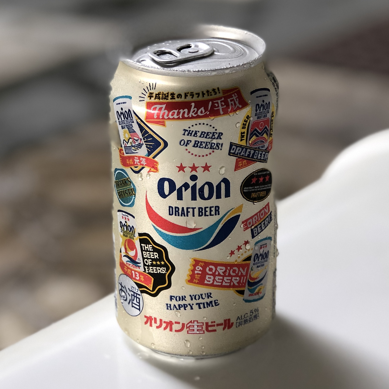 오리온 맥주를 피사체로 하고 전망을 배경으로 사진을 몇 장 찍었다. 그러고 보니 맥주 캔의 레이블이 예전과 조금 달라 보였다. 앞면은 똑같은데 뒷면이 달랐다. 작년에는 보지 못 했던 거였다. 오라온 맥주는 1973년에 처음으로 드래프트 맥주를 캔맥주로 출시하였다. 현재와 같은 캔의 디자인이 만들어진 건 2015년이다. 원래는 원색 계열의 디자인이었는데 샴페인 골드 색상에 맞춰 디자인을 변경하였다. 세 개의 별과 오리온 로고를 입혔고, 세 가지 색의 물결 모양을 추가하였다. 빨강은 오키나와의 태양을, 파랑은 오키나와의 하늘을, 초록은 오키나와 바다를 의미한다. 올해 출시된 캔의 뒷면에는 그동안 캔맥주의 역사가 들어 있다.