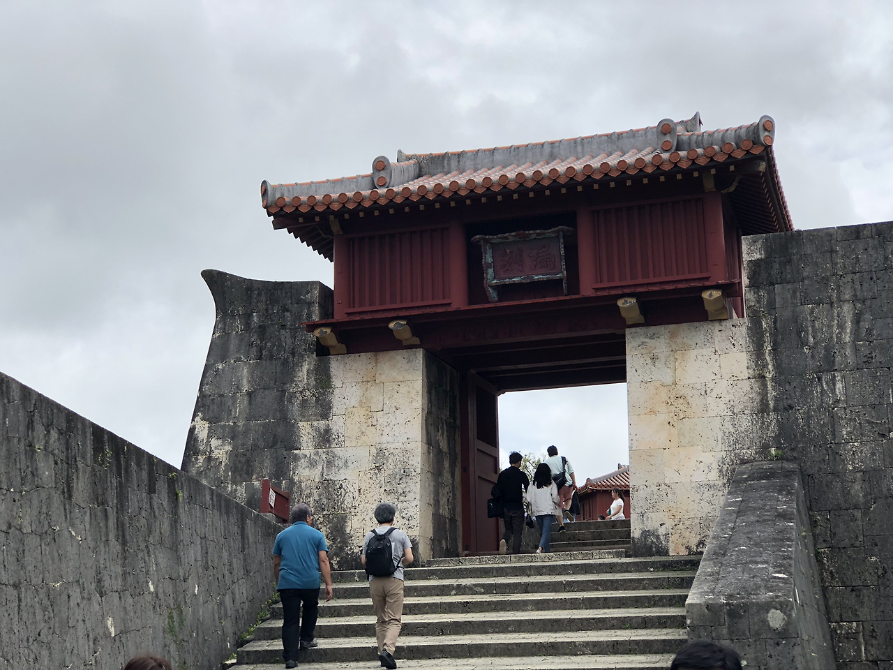 즈이센몬을 지나 약간의 계단을 걸으니 바로 로우코쿠몬이 보였다. 문과 문 사이가 이렇게 가까워도 되나 싶을 정도의 거리였다. 로우코쿠몬은 슈리성에 들어가는 세 번째 관문이다. 누각(漏刻)은 한자로 물시계를 의미하는 말로 누각문은 ‘시간을 측정하는 문’이라는 뜻이다. 문 망루에 수조가 설치되어 있고 거기에서 물이 새는 양으로 시간을 측정했다고 전해진다. 시간이 측정되면 북을 치며 슈리 성내의 서쪽 전망대에 전달해 성 내외로 시간을 알렸다고 한다.