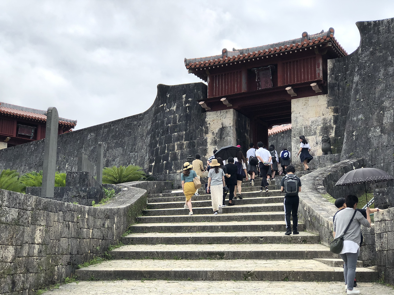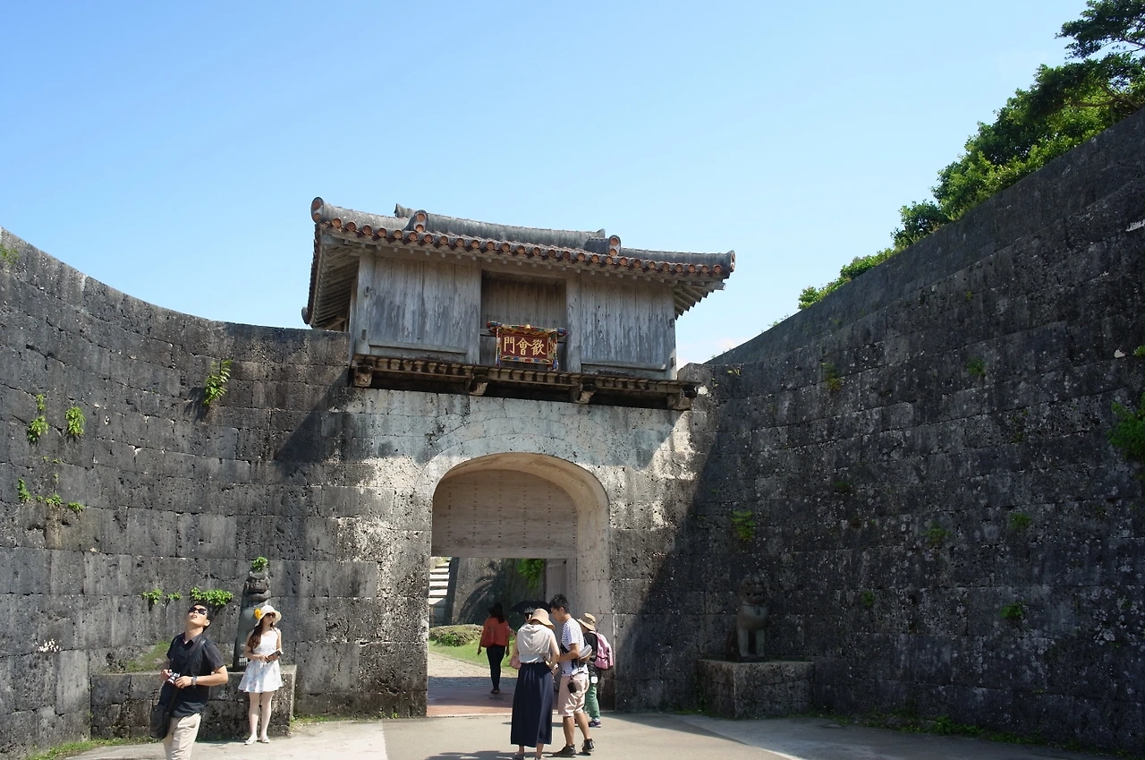 임시 주차장에서 오르막 길을 걸었다. 슈리성에 오르는 언덕길이 아니라 슈리성 입구에 오르는 언덕길을 걸었다. 저 멀리 슈리성 입구가 보였다. 그동안 책과 인터넷에서 수 없이 봐 둔 모습이었다. 혼자만의 여행이었다면 이 정도로 봐 두지 않았을 텐데 가족의 여행 가이드가 되기 위해서 많이도 공부해 놨다. 슈리성 입구에 있는 휴게소 ‘스이무이칸’에서 당과 수분을 보충하고 짐을 보관한 후 본격적으로 성에 오를 채비를 했다. 오리온 맥주도 하나 챙겼다. 옛날 이 언덕길을 따라 슈리성에 올랐을 류큐 왕족들을 상상하며 천천히 걸었다.