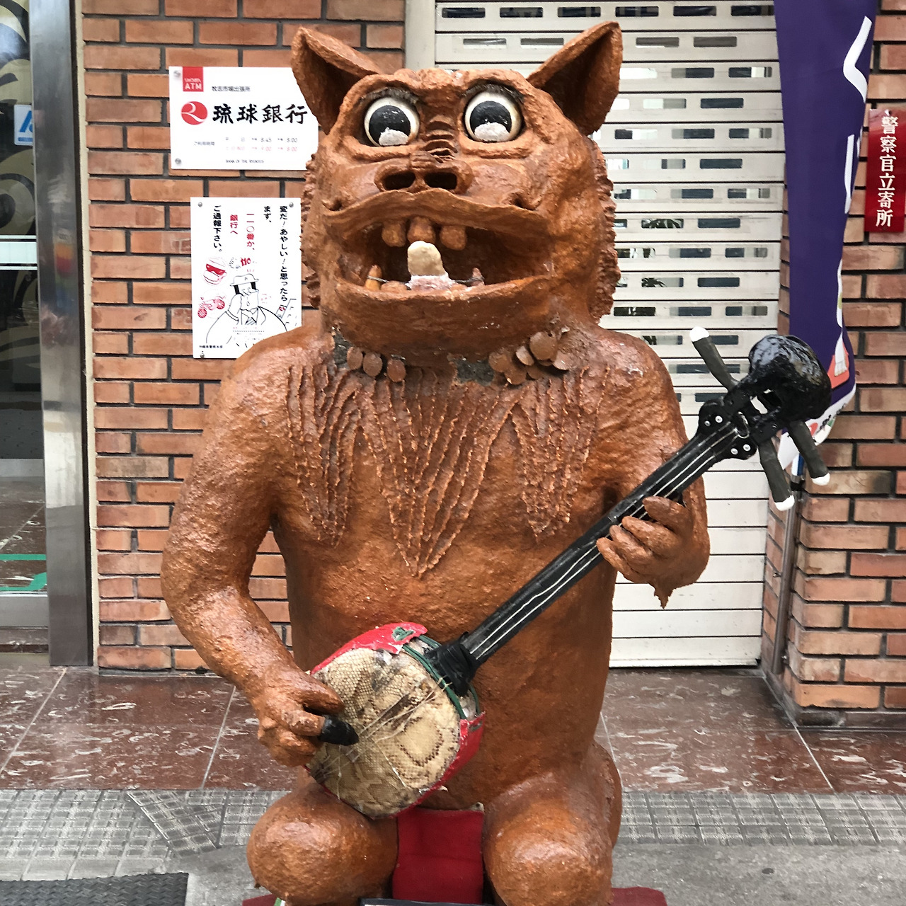 수산물 시장을 한 바퀴 돌고 밖으로 나왔다. 회 배만 부르고 다른 배는 텅텅 비었다. 해산물이 아닌 다른 무언가를 먹고 싶었다. 오키나와는 돼지가 유명하니 돼지고기로 된 길거리 음식이 있지 않을까 했는데 많지는 않았다. 간혹 제주도 아강발 같은 족발이 있긴 했으나 해맑은 돼지 얼굴이 더 많이 보였다. 그리고 이 시장의 명물 시사는 오키나와 전통 악기 산신을 연주하고 있었다. 산신은 여기서 ‘하브’라고 부르는 뱀의 껍질로 만든 것이었다.