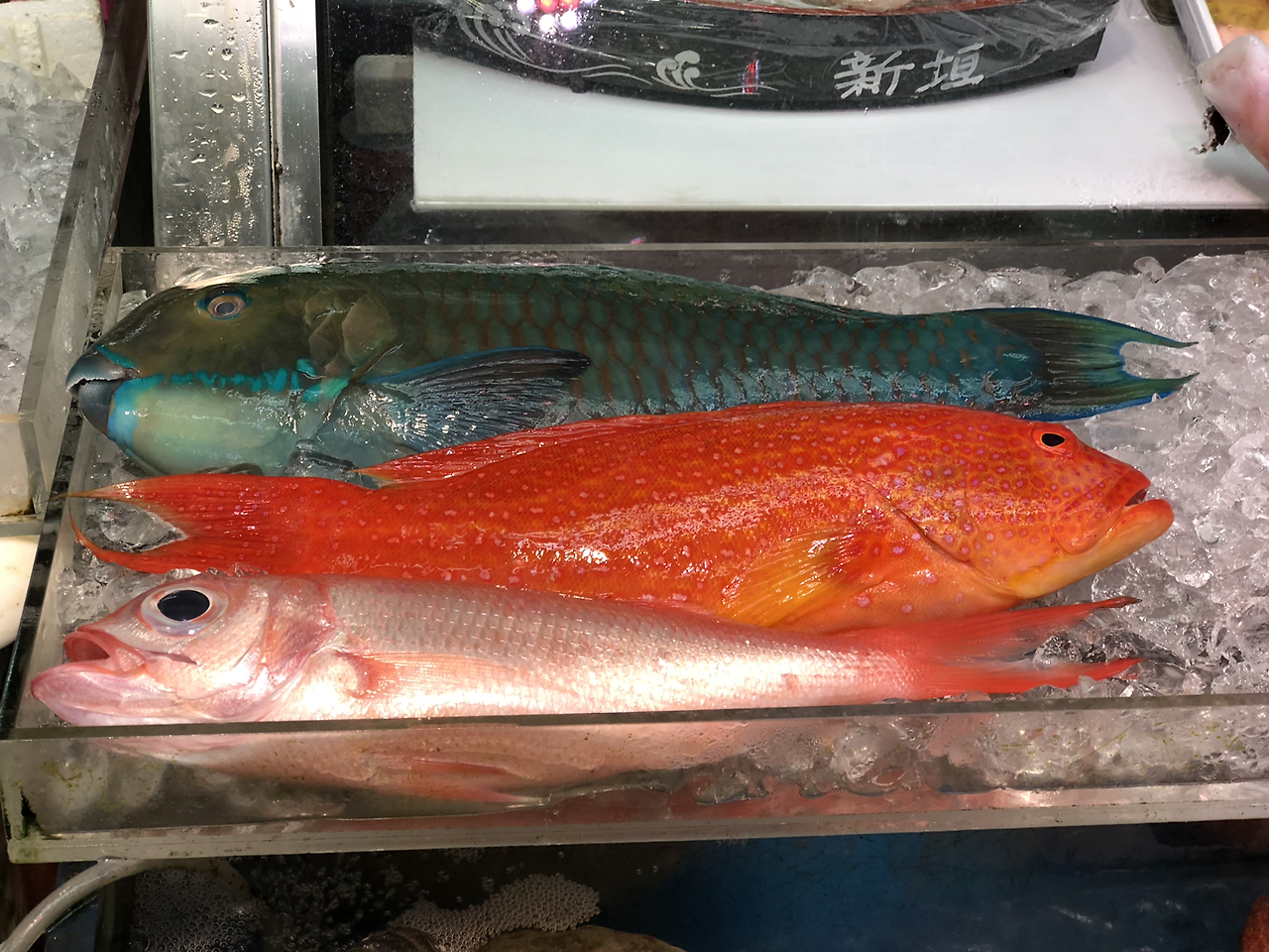 울루루 서점의 건너편에는 시장의 하이라이트인 수산물 시장이 있다. 마키시 시장을 겉에서만 보면 한국의 시장과 별반 다를 게 없어 보일 수 있다. 하지만 이 시장의 진면목은 수산물 시장에 있다. 수산물 시장은 노점이 아니라 하나의 건물 안에 모여 있다. 수산물 시장에서는 오키나와 근방에서 잡은 한국에서 볼 수 없는 어류로 가득하다. 온통 붉은색 물고기, 온통 파란색 물고기, 야광색이 나는 조개, 거대한 랍스터 등 컬러풀하고 크기도 거대하다. 저걸 어떻게 먹을까 했던 파란색 물고기를 회로 치는 걸 봤다. 두꺼운 칼로 비늘을 벗기고 주전자에 뜨거운 물로 껍질을 살짝 익힌 후 회를 썬다. 맛이 없어 보이던 파란색이 회로 써니 꽤 먹음직해 보였다. 우리는 모둠회를 먹었는데 그중에 저 파란색 생선도 있었을지 모르는 일이다.