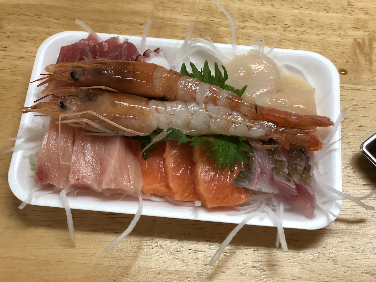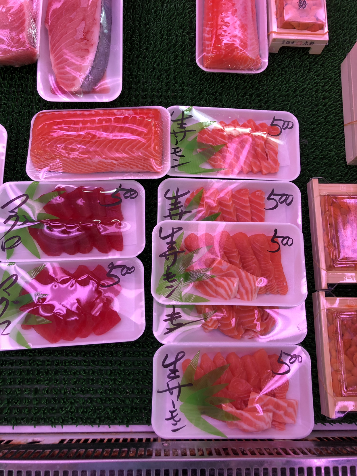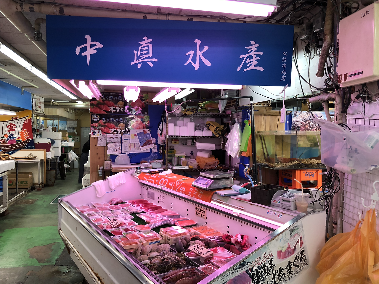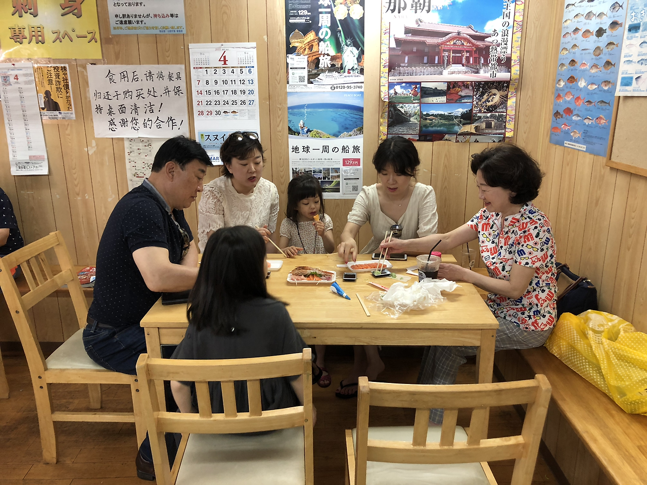 여기서 회를 사고 먹는 과정은 노량진 시장과 비슷하다. 1층에서 회를 사서 2층으로 가 자릿세를 주고 먹으면 된다. 자릿세가 성인 1인당 보통 500엔 정도 하는데 회만 맛볼 거면 굳이 2층으로 갈 필요는 없다. 1층 군데군데에 앉을 수 있는 테이블이 있다. 여긴 자릿세가 없으니 편하게 앉으면 된다. 밖에서 술을 사 와서 마셔도 된다. 우리는 500엔짜리 모둠회와 다른 가게에서 2천엔 짜리 연어회를 샀다. 간혹 간장 값이나 나무젓가락 값을 따로 받는 곳도 있으나 우리에게는 받지 않았다. 연어회가 너무 비싸다고 하니 안 받은 듯하다. 회는 신선하고 맛있었다. 모둠회는 막 포장하고 있길래 바로 산 것이다. 모둠회가 싸다 보니 연어회가 비싸게 보였지만, 신선함과 맛에 비해서는 비싼 편이 아니었다. 그런데 여기 있는 모든 회가 신선한 것은 아니다. 특히 장인어른이 시킨 참치회가 그랬다.