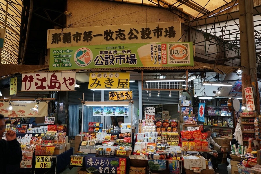 '나하시장제일마키시공설시장'이라는 현판이 보였다. 마키시 공설시장 (牧志公設市場)은 종전 직후인 1947년 경에 나하의 도자기 상인들이 모여 자연적으로 발생했던 암시장 때문에 생겼다. 이후 암시장 주변이 점점 커지고 도자기뿐만 아니라 다양한 상품이 거래되기 시작하였다. 이렇듯 상점과 사람들이 모여들기 시작하니 사설 시장에서의 불법 점거와 위생 문제가 대두되었다. 이를 해결하기 위해 나하시는 1950년 목조 주택 4채를 지어 정식으로 시장을 세웠다. 하지만 1962년에 시장이 소실되었고 1972년에 현재의 부지에 총면적 1,419 평방미터의 공설 시장으로 재건하였다. 현재는 129개의 업체가 들어서 있고, 시장 주변까지 포함하면 700개의 점포가 있다고 한다. 마키시 시장에 있는 점포들은 종전 직후부터 시작하여 창업한 지 5~60년 정도가 되는 가족 경영이 대부분이다. 마키시 시장은 오키나와 물류의 거점으로 사람과 물자가 몰려들어 종전 후 폐허가 된 나하시의 국제거리를 발전시킨 주역이다.