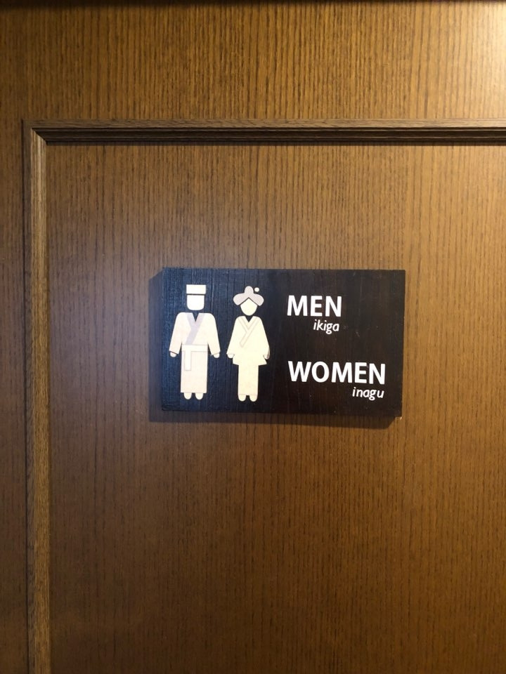 비가 한 두 방울씩 떨어지기 시작했다. 산책을 마치자며 서둘러 일어섰다. 걷다 보니 마음속에 점찍어 놓은 카페가 갑자기 나타났다. 커피를 먼저 마시긴 했지만 이 곳에서 식사를 하기로 했다. 이 곳은 '카페 차하야부란'이라는 곳이다. 바다를 조망할 수 있는 넓은 창이 있고, 밖으로 나오면 바다에 근접한 작은 정원이 있었다. 간단한 식사와 디저트를 먹을 수 있는 곳이었다. 우리들은 라후테이라고 하는 오키나와 돼지고기가 들어간 덮밥과 닭고기가 들어간 중국식 죽, 오키나와 소바와 한국식 비빔밥을 시켰다. 장모님은 돼지고기 덮밥이 맛있다고 하셨고, 장인어른은 오랜만에 한국식 식사에 만족하셨다. 아이들은 죽을 잘 먹었다. 의외로 오키나와 소바가 맛이 없었다 - 이번 여행에서 오키나와 소바를 두 차례 먹었는데 둘 다 만족하지 못했다. 화장실에 가니 남자와 여자를 뜻하는 낯선 단어가 보였다. 남자는 '이키가', 여자는 '이나구'. 직원에게 물어보니 예상대로 남자와 여자를 뜻하는 오키나와 방언이라고 하셨다.