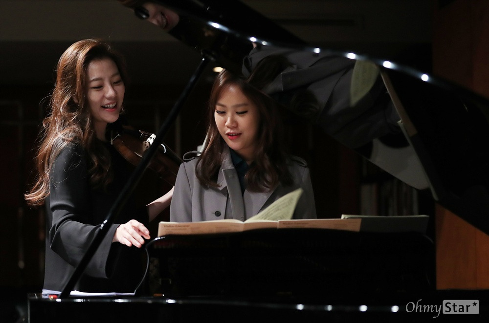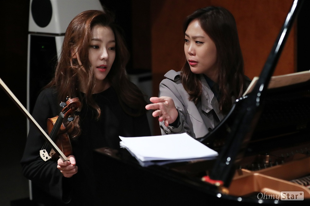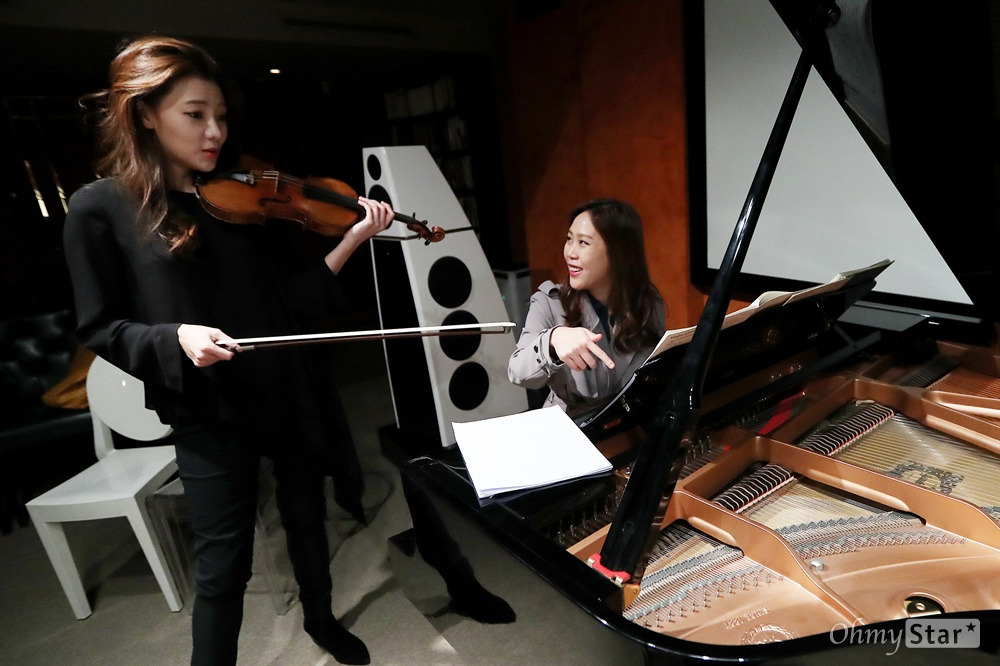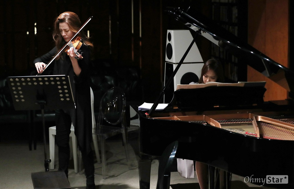 쇼케이스 한 시간 전. 리허설은 짧은 담소와 웃음으로 시작됐다. 풍월당에 도착한 바이올리니스트 클라라 주미 강(29)과 피아니스트 손열음(30)은 어질러진 악보에 웃음을 터뜨리곤 주섬주섬 정돈부터 했다. "1번 말고 3번 할래?" 주미 강의 제안에 손열음은 "3번은 누가 (악보를) 넘겨줘야 해"라고 답했다. "1번 하자." 주미 강의 말로 리허설은 시작됐다. 만연했던 웃음기가 사라졌고, 곧장 몰입했다.