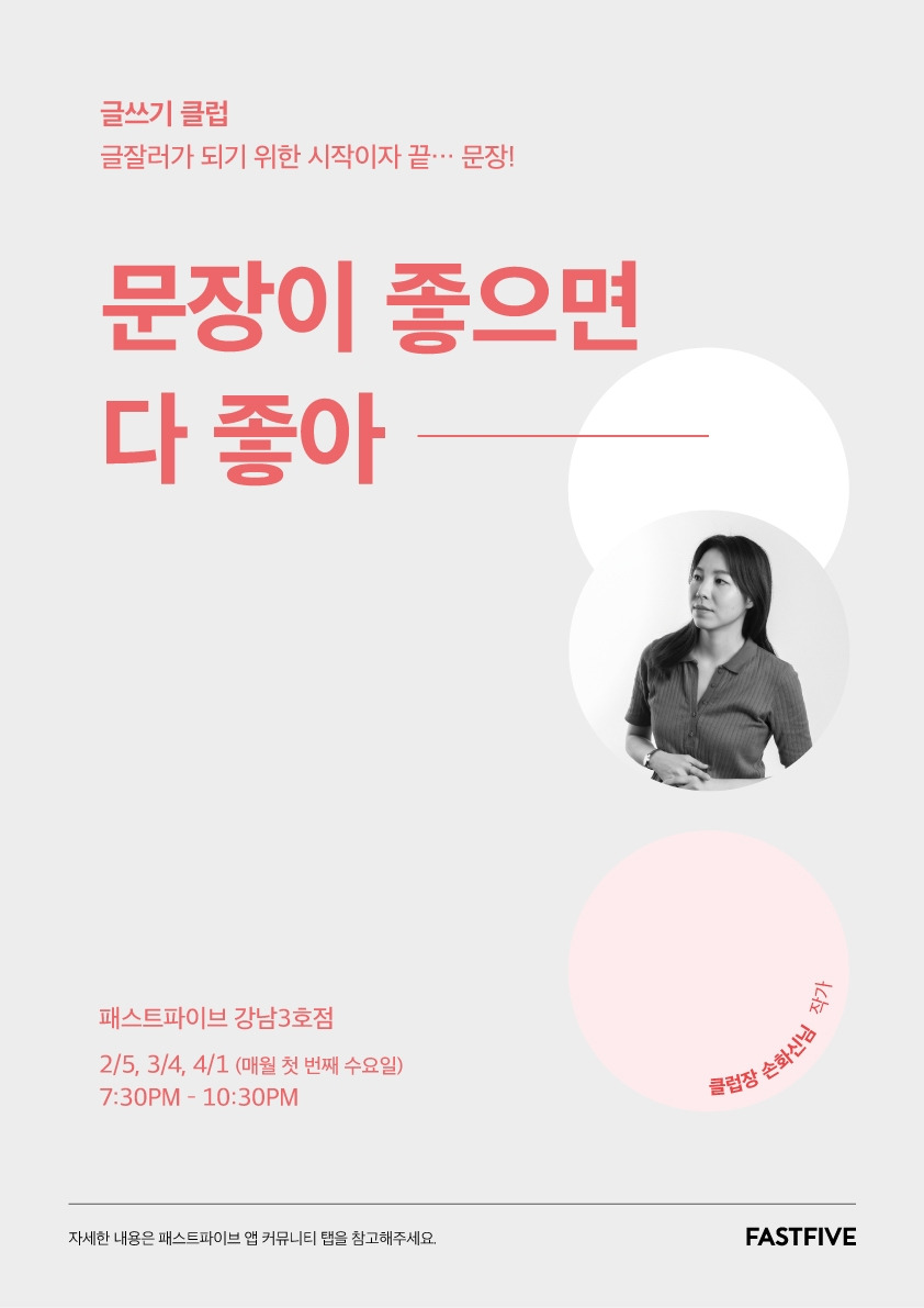 다음은 이 클럽을 주관하는 '패스트파이브(FASTFIVE)'에 등록된 글입니다. 클럽 참여 신청은 맨 아래에 있는 패스트파이브 홈페이지를 통해 가능합니다. 한 마디로 소개하자면 문장 쓰는 훈련을 석 달에 걸쳐 3회(각 3시간씩) 하는 글쓰기 클럽으로, 제가 클럽장이 되어 이끌며 문장 쓰기 노하우 등을 나누게 됩니다. 책 두 권을 활용하게 되며, 총 10명을 모집합니다. 유료클럽입니다.