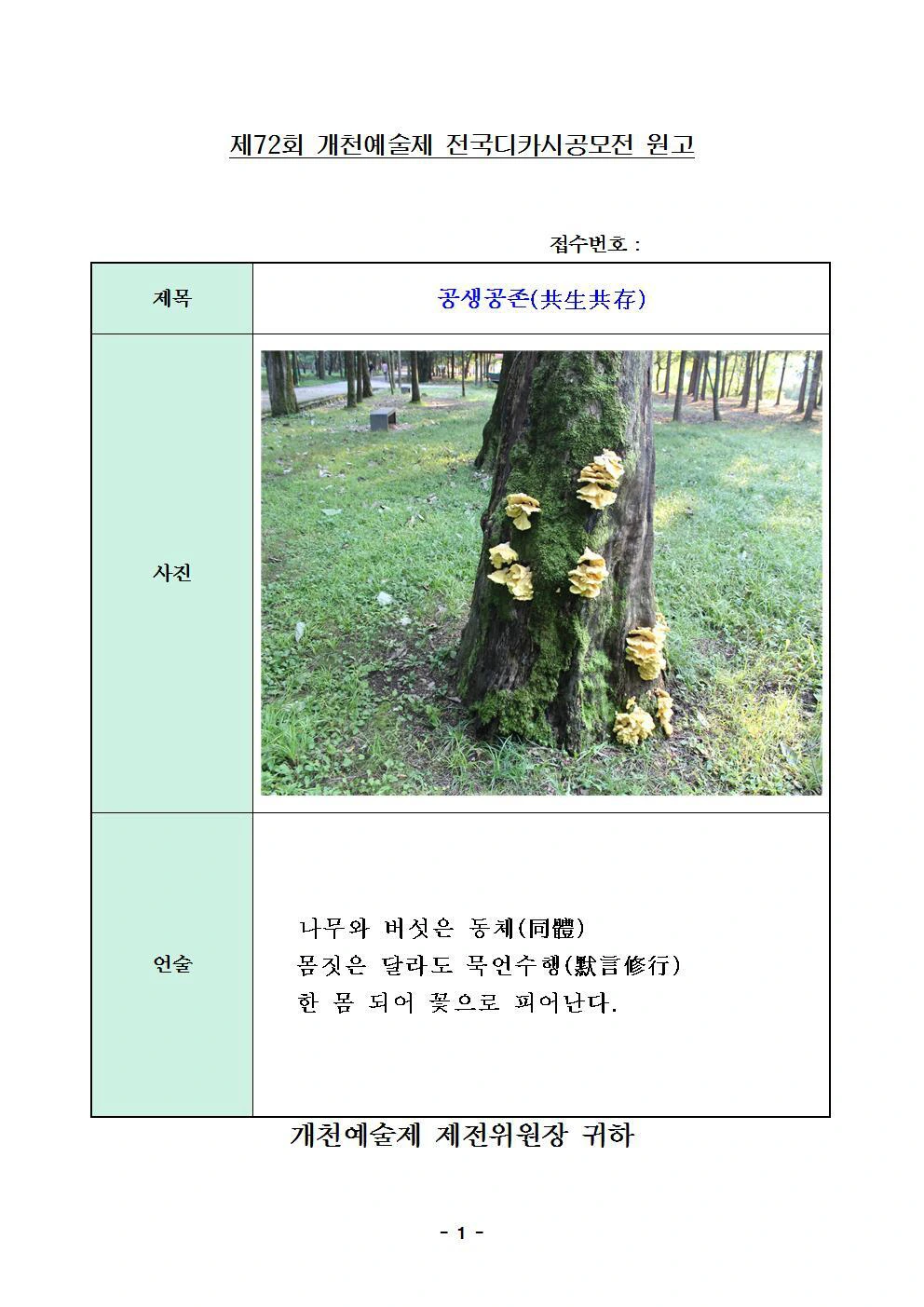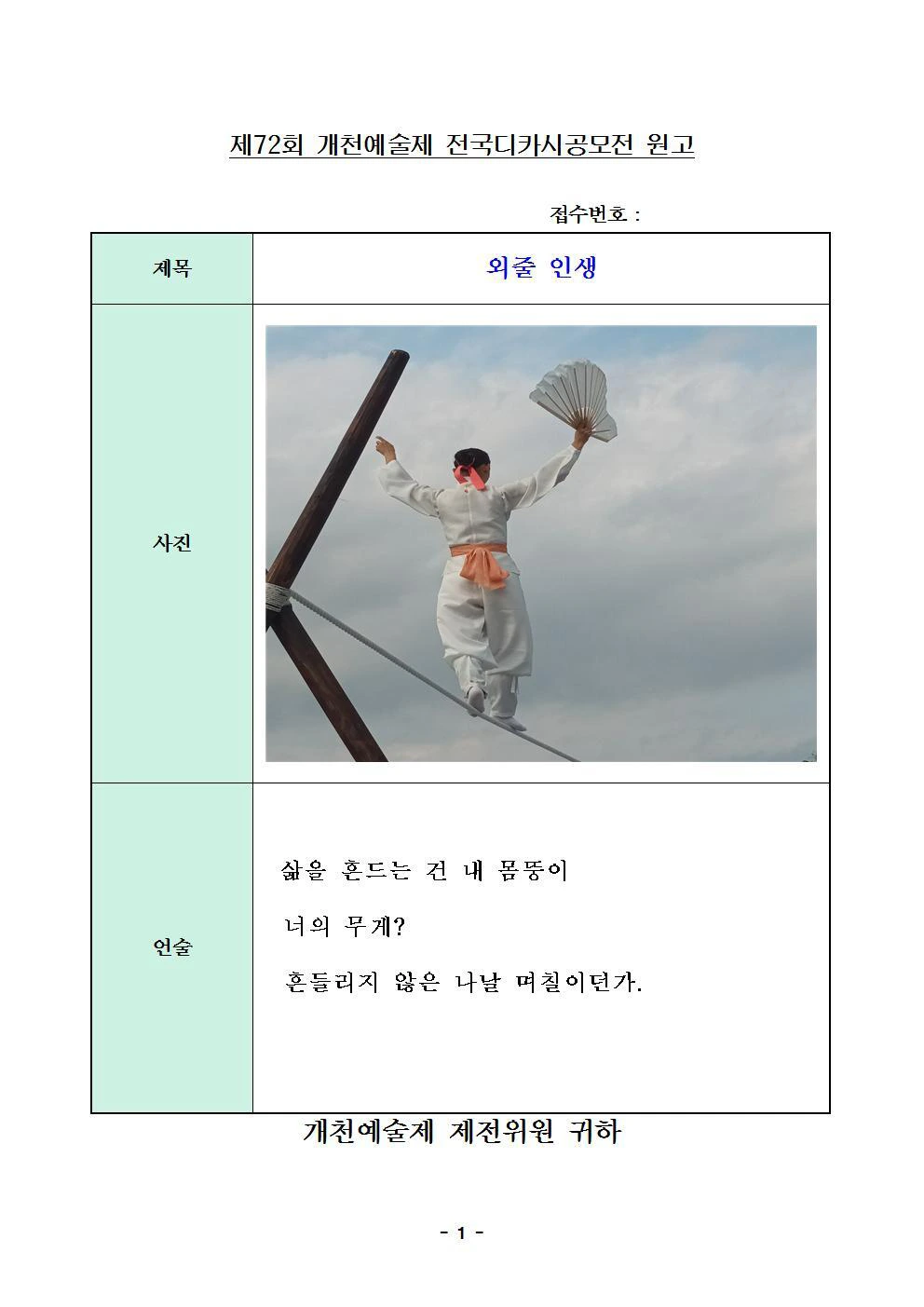 디카시에 대한 공부가 부족하지만 나는 2023년 제72회 개천예술제 디카시 공모전에 작품 2편을 응모하여 뜻밖에 입상한 바 있다.