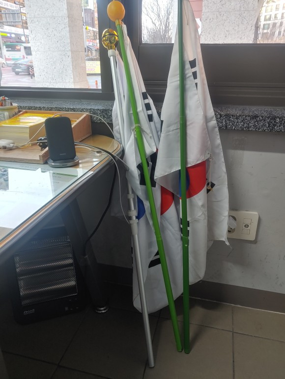 태극기를 걷어 윤진이라는 학생에게 건넸다. 윤진이는 내가 태극기를 내려준 걸 받더니 신이 났는지 아파트 주변을 더 돌아다녔나 보다. 친구 하나 붙들고 여기저기서 태극기를 주웠다며 초소로 몇 개를 더 가져왔다. 저녁밥시간도 됐고 해서 집으로 돌려보내려 했으나, 아이는 괘념치 않고 경비원이 해야 하는 일을 돕고 있었다.