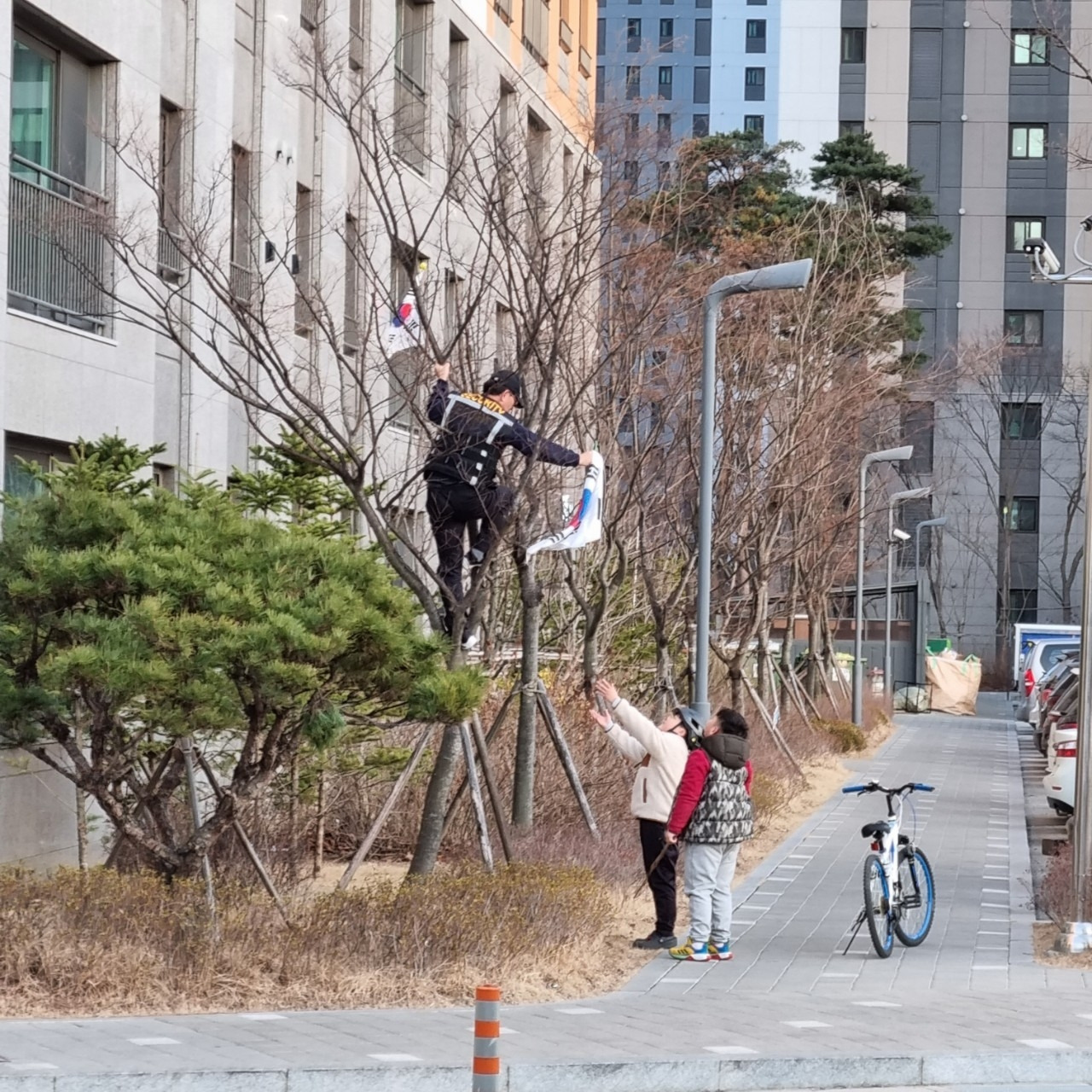 그런 장면을 보고 얼마 지나지 않아 한 초등학생이 초소를 찾았다. 아파트 주변에 떨어진 태극기를 주인 찾아 달라며 주워 오고, 초소 옆 동 벚나무에도 태극기가 걸려 있다고 했다.