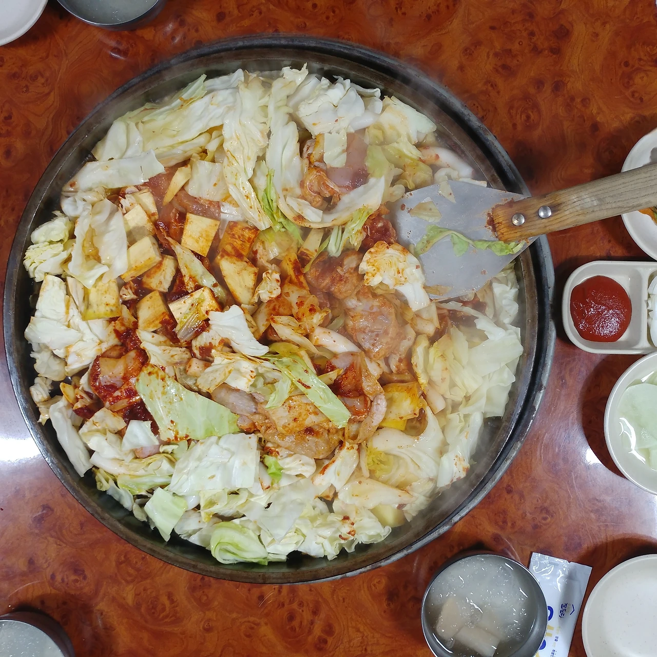 대기표 없이 기다리게 하는 주인의 배포가 만만치 않다. 집에 있는 식구들에게 국밥을 먹이려고 포장 주문해 간 적도 있는데, 지금은 그마저도 허용하지 않는단다. ‘공간이 협소한 관계로 더 많은 혼란이 야기되어 순번 대기표는 사용하지 않고 있습니다.’라는 벽보의 문구가 말해주듯 식당 주인은 손님들의 인내심을 시험하며 전표만 득득 긁고 있다.