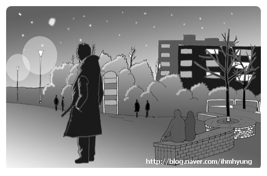 호수 공원 건너편 빌딩 사이로 사람들이 흘러들어 가고 되밀려 나온다. 한 무리의 젊은이들이 그들만의 언어로 밤하늘을 수놓으며 어둠 속으로 사라진다. 밤바람이 제법 싸늘하게 느껴지는 걸 보면 시간이 꽤 흐른 것 같다. 아파트 창마다 불빛이 더해진다. 거리의 자동차들도 경적소리를 내며 귀가를 서두른다.