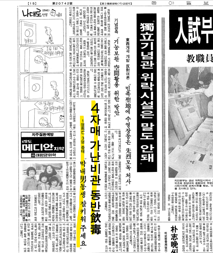동아일보 1989년 2월 28일(석간) 사회면 〈4 자매 가난비관 동반음독〉 기사 / 해바라기 〈사랑으로〉 가사의 직접적인 모티프가 된 “그 기사”이다.