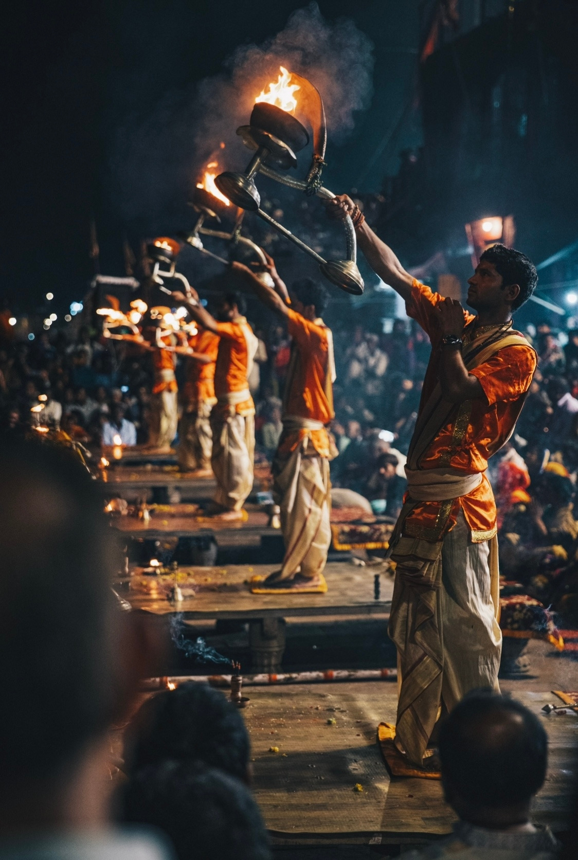 그날 밤 숙소에서 만난 친구들과 갠지스 강가에서 열리는 제사 의식을 보러 갔다. 매일 저녁 이곳에서는 갠지스강과 시바 신, 태양의 신 수르야, 불의 신 아그니 등을 향해 전 우주를 위한 제사 의식을 거행한다. 사제들이 모여 기도문을 외우고 향을 피우며 의식이 시작된다. 제사의식이 진행되는 강가는 한낮과는 너무나도 다른 분위기였다. 힌두교도들과 여행객 등 수많은 사람들이 한데 몰려있었다. 친구들과 인파를 피해 보트에 올랐다. 갠지스강 한가운데에서 의식이 거행되는 쪽을 바라보았다. 강 위에는 사람들이 띄워놓은 수많은 꽃과 초가 가득했다.