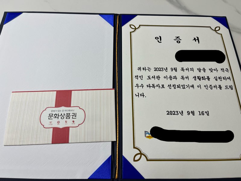 오전에 도서관에 들러 상장과 상품을 받고 사진도 하나 찍었다. 보도자료에 실린단다. 어설프게 미소를 지으며 사진을 찍고 돌아왔다. 새로 빌린 책과 함께. 상품은 무려 5만 원어치의 문화상품권. 매달 세 권씩 희망도서를 신청해 받는 것도 감사한데, 상품권까지 주다니. 동네 도서관을 사랑하지 않을 도리가 있나.
