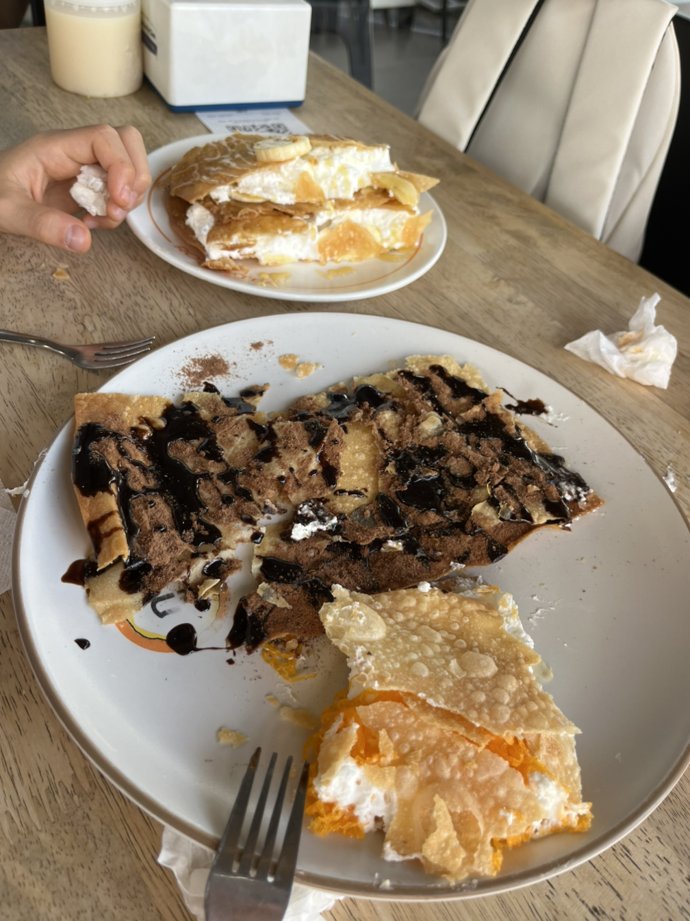 바삭하게 구운 반죽에 크림이나 바나나, 초콜릿이나 카라멜 시럽 등을 얹은 게 로띠다. 태국 사람들의 국민 간식이라나. 단 걸 좋아하는 아이들이 정신없이 흡입을 한다. 포크가 있지만 바삭하다 보니 무용지물이다. 깔끔하게 먹는 걸 포기하고 손가락과 입주변에 잔뜩 묻히며 먹는다. 때로는 일찌감치 포기하는 게 속 편할 때가 있다.