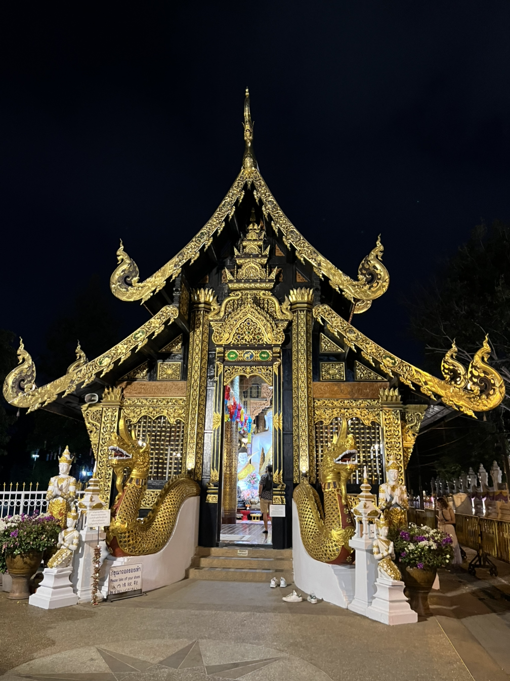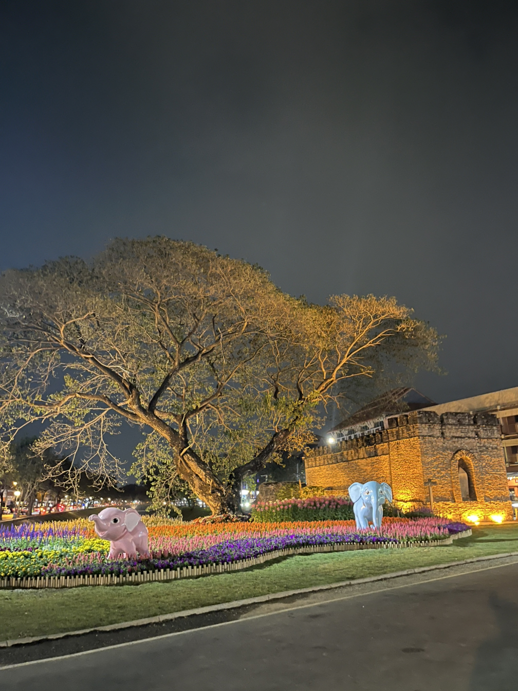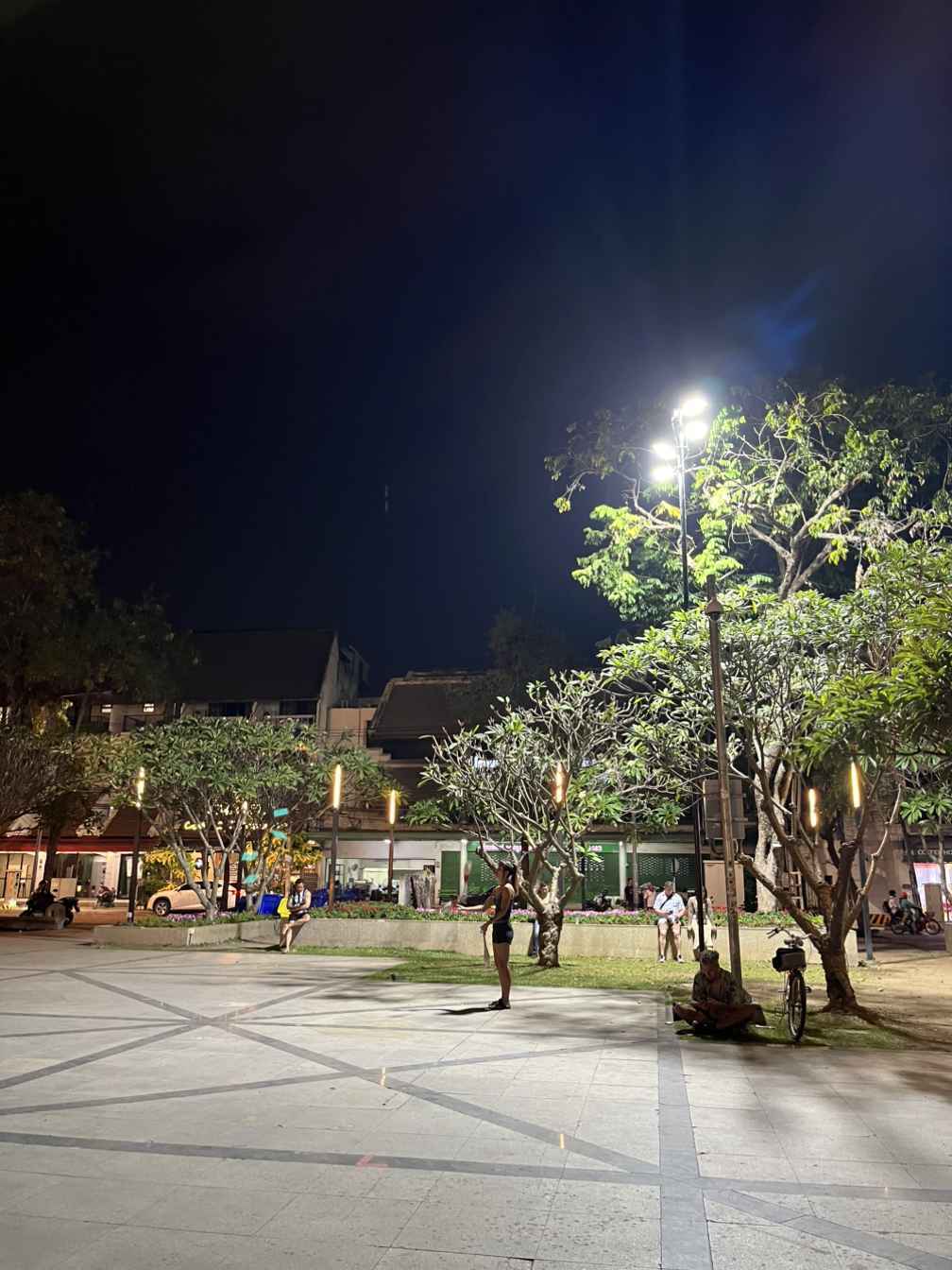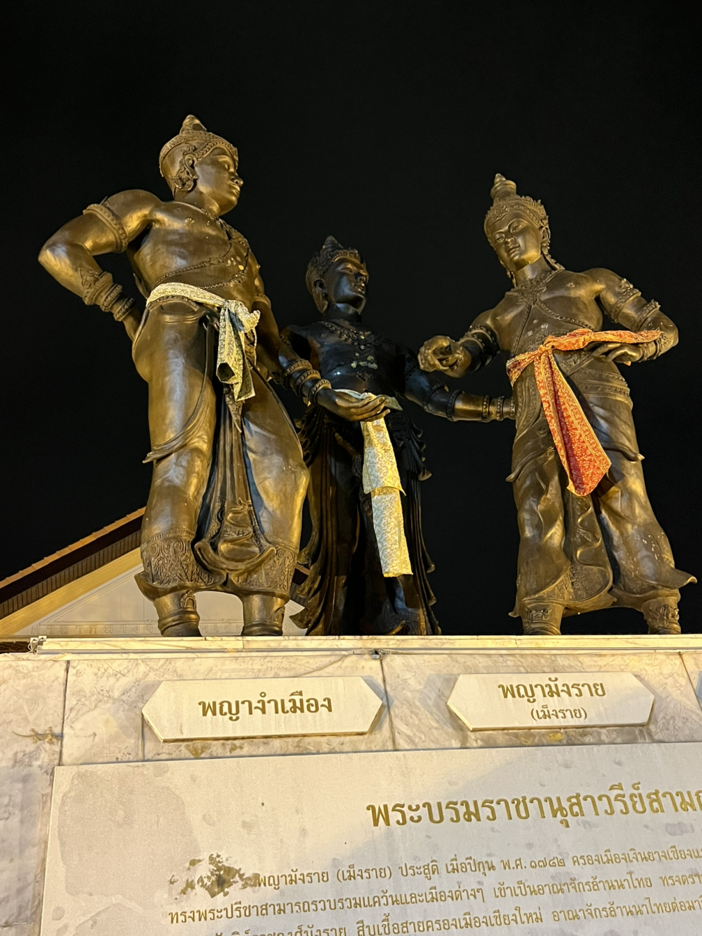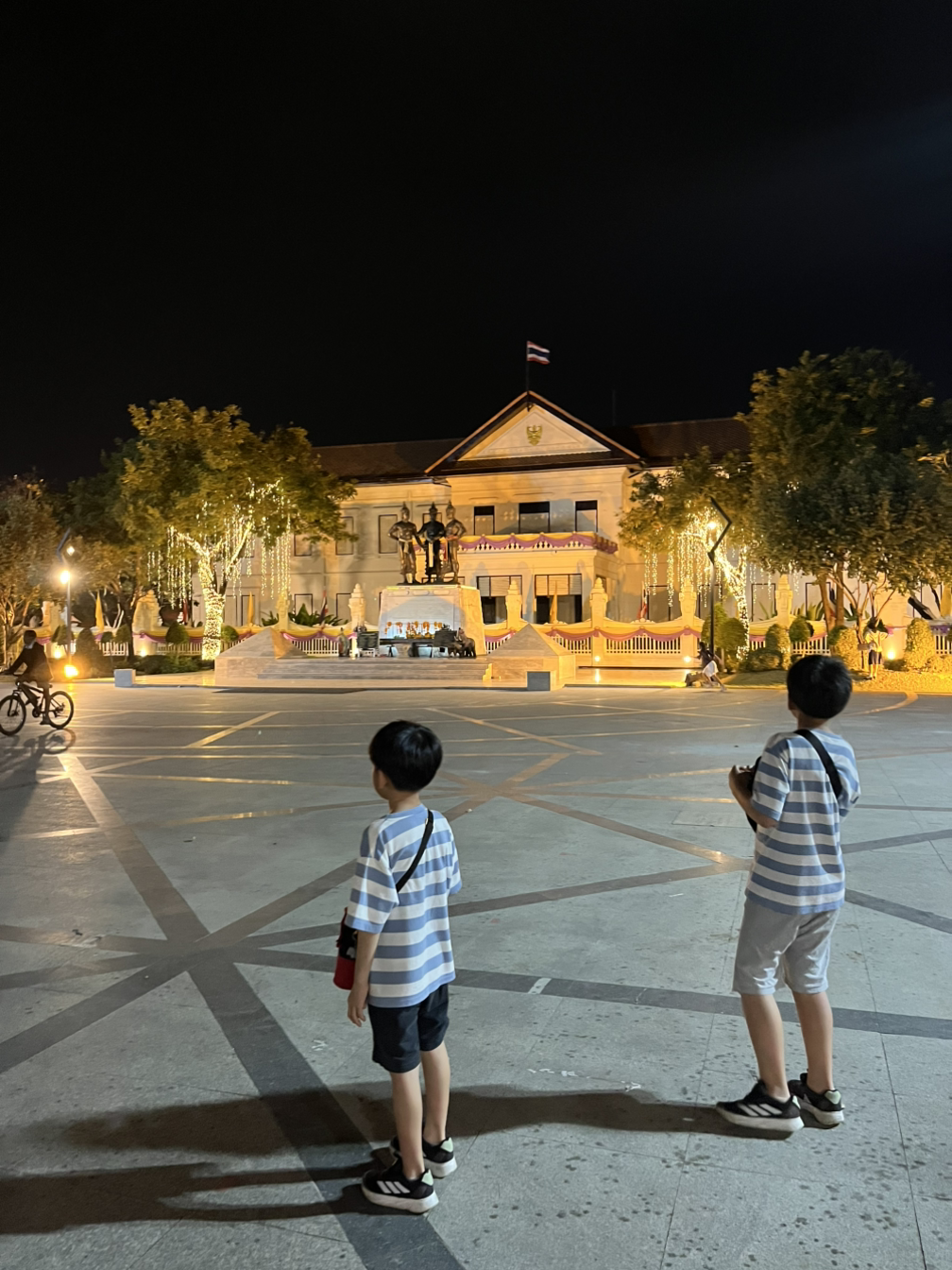 성곽과 수로로 둘러싸인 올드시티는 캄캄한 밤에도 매력이 넘친다. 여전히 길은 오가는 사람들로 붐빈다. 빨리 숙소로 돌아가는 그랩을 부르라고 성화하는 둘째에게 조금만 더 조금만 더를 외쳐가며 밤거리를 걸었다. 걷다 보니 어제 놓친 삼왕상도 보이고, 처음 들어보는 이름의 작은 사원도 눈에 띈다. 밤산책을 즐기는 작은 도마뱀들과 저글링과 보드를 연습하는 여행객들까지, 노란 가로등 불빛 아래에 서니 여행지의 모든 것들이 낭만이다.