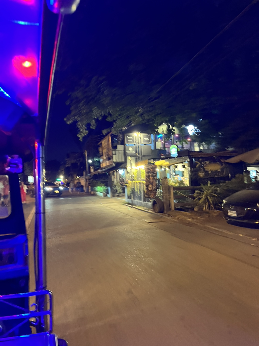 이제 그랩을 불러야지 하는데 왼편에서 툭툭이 다가왔다. 치앙마이에서는 좀 비싸긴 하지만 시원한 바람을 맞으며 밤에 타는 툭툭이 최고라 들었는데… 내가 망설이는 찰나 둘째가 냉큼 손을 뻗었다. 갑자기 멈춰서는 툭툭. 숙소 주소를 말하니 150바트를 부른다. 그랩을 타도 그 정도는 나올텐데… 흥정을 좀 하려다 인상 좋은 기사님 얼굴에 괜찮은 가격임을 인정하고 툭툭에 올랐다.