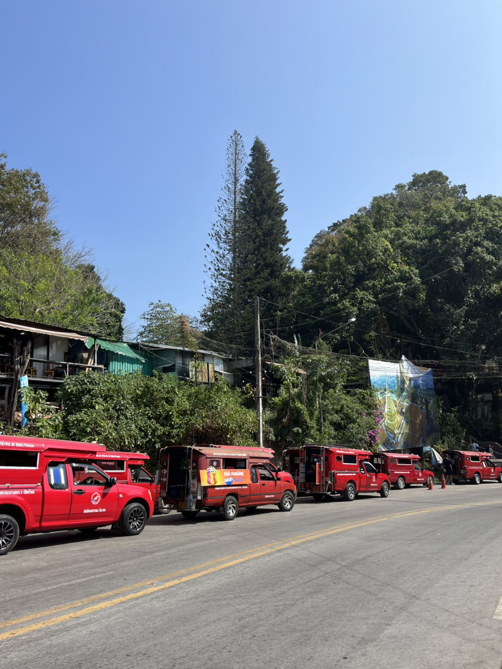 사원 입구까지 오르니 차량이 제법 많았다. 특히 빨간색 썽태우가 잔뜩 줄을 지어 주차돼 있었다.