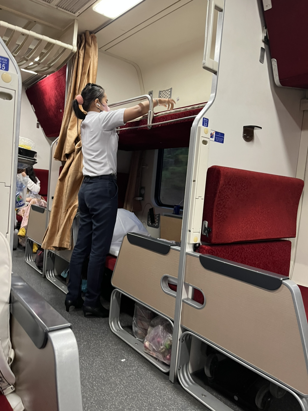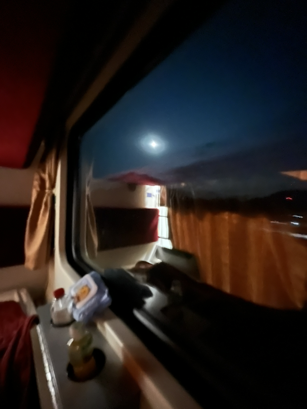 듣던대로 에어컨이 풀가동되고 있어 처음에는 무척 서늘해 긴 옷을 꺼내 입었지만, 침대가 만들어지고 난 뒤 커튼을 치고 이불을 덮으니 오히려 조금 덥게 느껴졌다. 차창 밖으로 이따금 보이는 사원의 불빛들과 마침 정월대보름이라 환하게 세상을 비추는 보름달을 계속 볼 수 있었던 건 잊지 못할 기억이다. 무엇보다 아이들이 만족하니 그걸로 되었다 생각해야지.