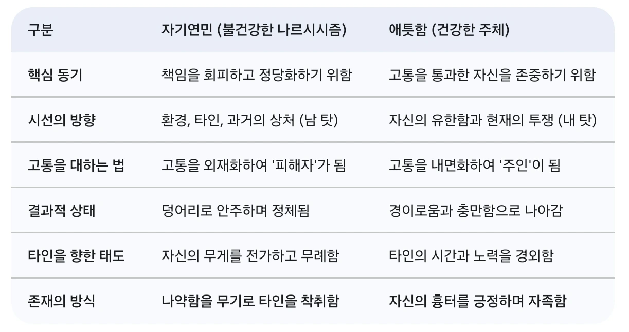 "자기 연민과 고통의 외재화"의 고리에 갇혀 스스로를 정당화하고 방어적인 착취와 공격성을 드러내는 태도에 대해 말하고자 하는 것이다.