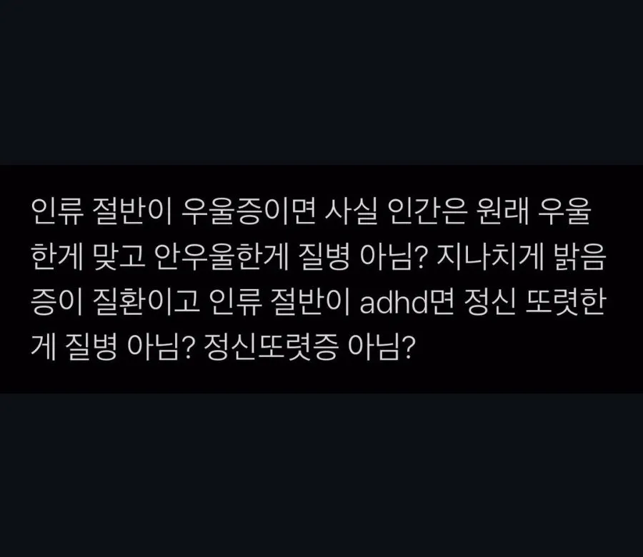 "인류 절반이 우울증이면 사실 인간은 원래 우울한 게 맞고, 안 우울한 게 질병 아님? 지나치게 밝음증이 질환이고, 인류 절반이 adhd면 정신 또렷한 게 질병 아님? 정신 또렷증 아님?"