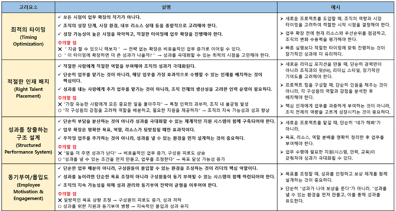✔ 업무 확장은 명확한 목표, 역할, 리소스가 뒷받침될 때만 효과적이다.
