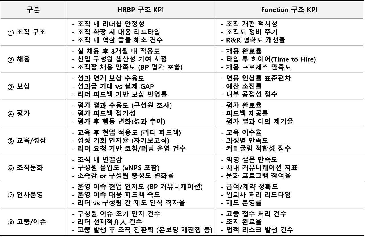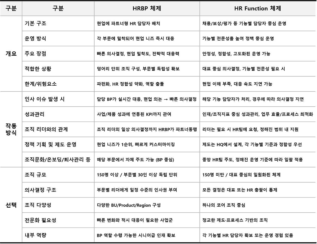 Function 체계는 안정성과 일관성을 통해 HR의 '백오피스적 가치'를 강화한다. 반면 HRBP 체계는 조직별 '프런트 성과 정렬'을 통해 HR의 존재 이유를 실무에 가깝게 재정의한다.