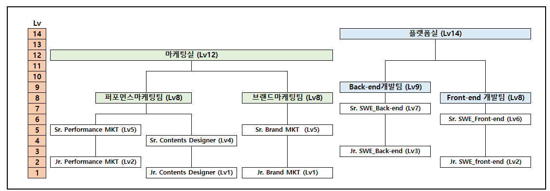 연차가 쌓이고 실력이 쌓였다고 Lv2 포지션이 Lv3이 되지 않는다. 저 그림은 맵이다 맵! 맵이 변경되는 것은 전체 맵을 조정 해야겠다 판단이 들었을 때지 그런 이유로 맵에 새로 포지션이 그려지고 포지션의 레벨이 임의로 변경되지 않는다. 즉 내가 Lv2 포지션에서 올라가려면 상위의 Lv5 포지션에 Fit 해야 한다.