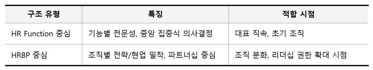 HRBP는 단순히 HR 직무의 진화형이 아니다. 그 자체로 조직 구조와 일하는 방식에 따른 선택지다. 회사마다 아래 중 어떤 구조를 택할지는 ‘조직 규모’와 ‘권한 배분 상태’에 따라 달라진다. HRBP는 하면 좋은 것이 아니라, 되려면 전제조건이 필요한 체제다.