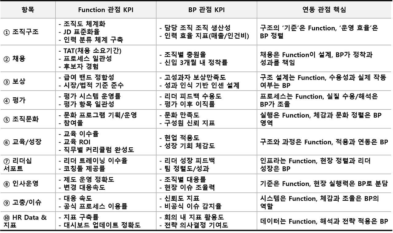 BP는 전문기능 설계자가 아닌, 문제 해결자이며 설계보다 “적용·운영” 중심이다. 즉, Function이 설계한 제도가 현장에서 작동하는가를 확인하고 조율하는 역할이 BP에게 있다면, BP는 Function의 구조적 지원 없이 독립적으로 성과를 낼 수 없다. 두 구조는 병렬이 아닌 상호의존 관계이다.