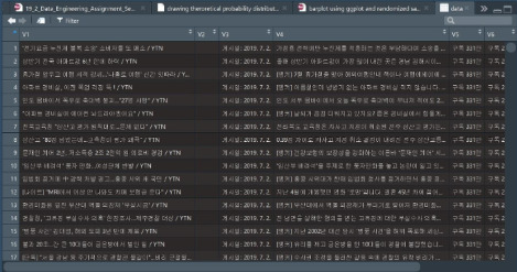 채널 'YTN News'에 있던 1,520개 동영상의 제목, 게시일과 함께 화면에 보이지 않지만 댓글과 좋아요 수, 조회수를 수집해 왔습니다. 데이터는 통계 프로그램 R을 통해 분석합니다.