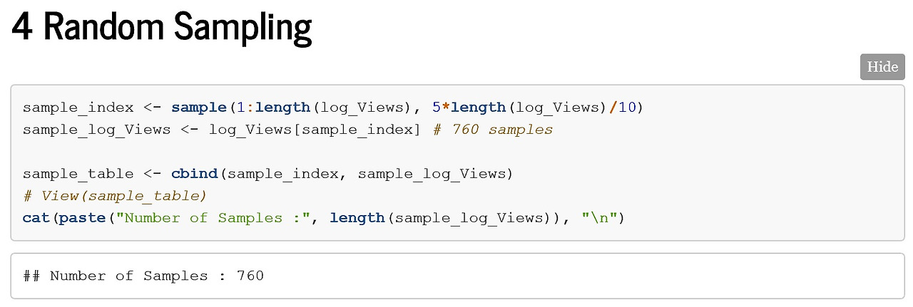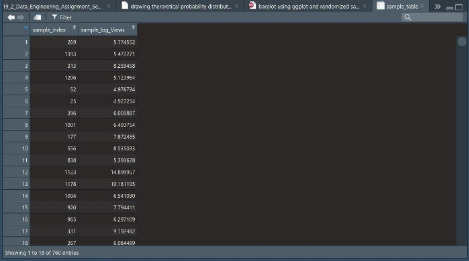 R에서 추출한 표본 데이터. 왼쪽 줄에 269, 1393 등으로 이어지는 게 추출한 데이터 번호이고, 그 오른쪽으로 소숫점 적힌 숫자가 로그 변환한 해당 데이터의 조회수다