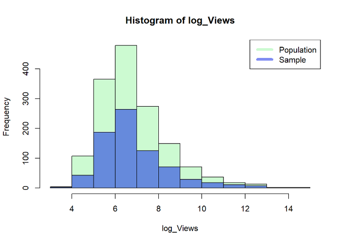 전체 집단과 표본집단의 조회수 분포를 같은 화면에 그렸습니다. 연두색이 전체 집단이고, 파란색이 표본 집단입니다. 그래프의 형태로 미루어볼 때 표본 집단이 전체 집단과 같은 분포를 갖는다는 것을 알 수 있습니다. 확률 추출을 해야 표본 집단이 전체 집단의 구성을 고루 반영해 대표성을 갖는 것입니다. 데이터 분포의 위치를 확인할 때 평균 값 또는 중앙값(자료를 작은 것부터 큰 것까지 순서대로 나열할 때 정중앙에 위치한 값)을 비교하는데 전체집단(평균 6.86, 중앙값 6.50)과 표본집단(6.86, 중앙값 6.48)이 크게 다르지 않습니다.