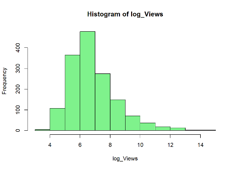 이럴 때 우리는 데이터를 '변환'합니다. 지금 같이 데이터가 극도로 비대칭이어서 분포를 확인하기 어렵거나, 회귀분석 등 모델링 등 하기에 앞서 정규분포 형태가 필요할 때 데이터 변환(Transformation) 작업을 거칩니다. 지금은 로그 변환(Log transformation)을 할 건데, 로그 함수가 큰 값은 줄이고 1 이하의 작은 값은 오히려 음수로 절대값을 늘리기 때문에 Momentous Function이라 부릅니다. 지금과 같은 경우 3백 여만 회에 달했던 송혜교 관련 영상의 조회수는 로그 변환을 하면 14.899로 줄어들게 됩니다. 따라서 위와 같이 좁혀진 범위에서 데이터 분포를 확인할 수 있는 거죠.