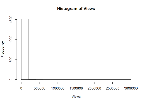 히스토그램이 저렇게 그려진 것은 평균적인 수준보다 조회수가 극도로 높은 동영상이 있기 때문입니다. 대부분의 동영상은 조회수 25만 회 이하를 기록했는데요, 6월 27일에 업로드된 '온갖 소문 돌자... 송혜교 측이 직접 밝힌 이혼 사유'가 조회수 2,957,802회를 기록해 위 그림 오른쪽 끝 편에 아주 작은 점으로 찍혀있을 겁니다. 히스토그램이 조회수의 제대로 된 분포를 나타내지 못하는 이유입니다.