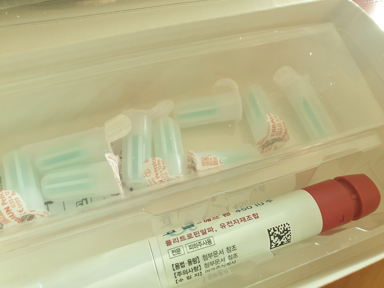 시험관 시술을 위해 대략 1,2주간 자가 피하주사로 호르몬을 복부에 투여한다