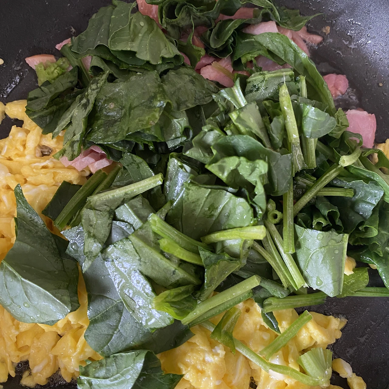 6. 스크램블 에그 형태가 되면 중불로 줄여주고 다듬은 시금치와 오리고기를 넣어준다.