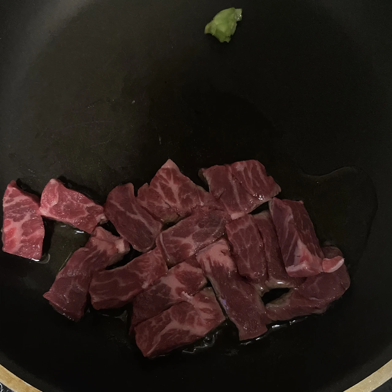 1. 기름을 넉넉히 프라이팬에 두른다. (이때, 참기름 한 숟갈을 함께 넣으면 고소한 냄새가 난다.)