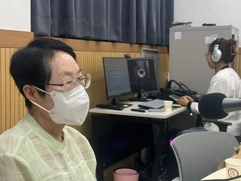 여든이 훌쩍 넘어 아흔에 가까운 김학분 어머님은 꼭 두유와 레몬사탕 그리고 알밤을 투명 비닐봉지에 둘둘 싸서 꼭 나에게 건넨다. 일흔 넘은 윤창숙 어머님은 한번 결석을 안 하신다. 그리고 단정한 옷차림에 늘 정갈한 자세로 진지하게 임한다. 역시 일흔 넘은 조갑만 어르신은 청성면 조천리에서 부러 나오신다. 월요일 오후 1시20분, 나에게 주어진 시간은 40분 남짓 정도 옥천노인복지관 1층 100호실에 허원혜 피디가 먼저 자리하여 준비를 한다. 윤창숙 어머니는 한번도 빠지지 않고 일요일에 꼭 원고를 카톡으로 보내주신다. 김학분 어머님은 빼어난 글씨체로 매일 일기를 쓴 것을 가져온다. 주로 학창시절 이야기와 먼저 가신 남편을 사모하는 이야기들이 주를 이룬다. 약간 기억력이 어두워지셔서 쓰고 낭독한 것을 다시 가져오기도 하시지만, 글씨만큼은 꼿꼿하고 수려하다. 김갑만 어르신은 최근 3-4개월 나오지 않으셨다가 다시 나오기 시작했다. 나한테 약간 서운한 게 있었다고 고백성사를 하셨지만, 다시 나온 것만도 어디인가. 괘념찮고 오히려 반갑다. 그렇게 옥천FM공동체라디오 은빛수다방 코너를 매주 월요일에 녹음을 한다. 사실 많이 있을 때는 10명 가까이 있었는데 이런 저런 이유로 글에 대한 부담으로 말하는 것에 대한 불안으로 여러명이 자연스레 떨어져 나갔고 두어명 남았을 때 그만하면 어떻겠냐는 의사를 내비쳤다. 하지만, 어르신들은 완강했다. 매주 이 날만 기다린다고. 계속하면 좋겠다고 강한 의사를 표현해 그냥 하기로 했다. 일정이 가끔 겹쳐 빠질 때도 있지만, 되도록 지키려는 편이다. 내가 인트로를 맡고 각자 한 주간의 써 온 원고를 각자의 목소리로 낭송하는 시간으로 메운다. 준비된 대본 같은 것은 없다. 나도 즉석에서 이야기를 시작하고 각자 마이크 순서가 정해지면 순서대로 이야기 하는 방식이다. 나는 어르신들의 이야기를 경청하고 어른신들은 각자의 이야기를 낭송하며 서로간의 원고를 갖고 맛깔나게 대화를 나누는 것이 이 코너의 포인트다. 칭찬하고 공감하면서 어르신들에게 한 주간의 살아갈 힘을 불어넣어 주는 것이다. 나에겐 너무나 훌륭한 고정 게스트이다. 나도 덩달아 살아갈 힘을 얻게 된다.