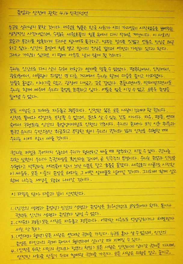 우리는 상실과 애통, 그리고 들끓는 분노로 존엄과 안전에 관한 권리를 선언한다. 우리는 약속한다. 세월호 참사를 기억하고 진실을 밝히고 정의를 세우기 위한 실천을 포기하지 않을 것임을. 또한 우리는 다짐한다. 이 세계에서 벌어지는 각종 재난과 참사, 그리고 비참에 관심을 기울이고 연대할 것임을. 우리는 존엄과 안전을 해치는 구조와 권력에 맞서 가려진 것을 들추어내고 목소리를 내는 데 주저하지 않겠다. 이 선언은 선언문으로 완결되는 것이 아니라 수많은 우리가 다시 말하고 외치고 행동하는 과정 속에서 완성되어 갈 것이다. 함께 손을 잡자. 함께 행동하자.